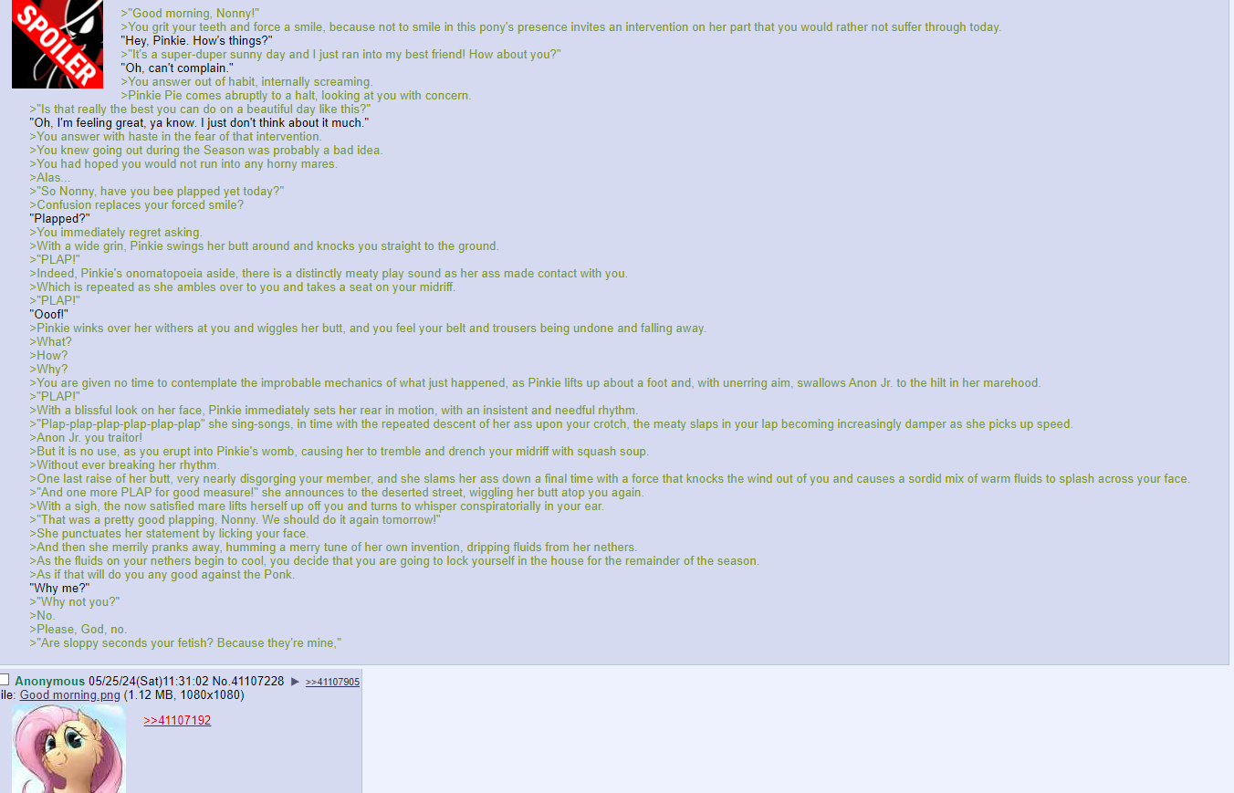>What is Flutterrape?Flutterrape is a collection of stories about ponies trying and failing to have sex with Anon, the only human in Equestria. While the title implies that it is Fluttershy trying to rape Anon, others may follow in her stead and attempt their own versions of rape. There are different versions of Flutterrape, but most are light-hearted comedies about the ponies failing in their attempts to get into Anon’s pants. Just because your story has Anon in it, doesn't mean it fits in this thread. Check other threads (AiE, RGRE etc) about story content before posting.>It's been 12 years, how is this thread still alive?A perverse mixture of necromancy and spite.>How do I start writing?Use your imagination, you nitwit. Additionally, brush up on your grammar and abandon your standards.Writing Guides:Clever Dick's Tips For Short Stories -- https://ponepaste.org/1274Driverbang's Writing Guide -- https://ponepaste.org/1275Navarone's Writing Rules -- https://ponepaste.org/1276For additional information, lurk or ask. You could also check out the T:EM/P/O or /bale/ threads for further writing advice, unless they're dead.So many threads have died, but only Flutterrape has remained. We shall always remain. We are bound to the fate of the board as a lich is bound to its phylactery. Welcome, anonymous.////Masterlist: https://ponepaste.org/user/FlutterrapeGeneralAuthor List: https://ponepaste.org/1270FIMfiction Group: http://www.fimfiction.net/group/211640/flutterrapeRequest Bin: https://ponepaste.org/1268Thread Archive: https://desuarchive.org/mlp/search/text/Flutterrape/previous thread: >>43026307