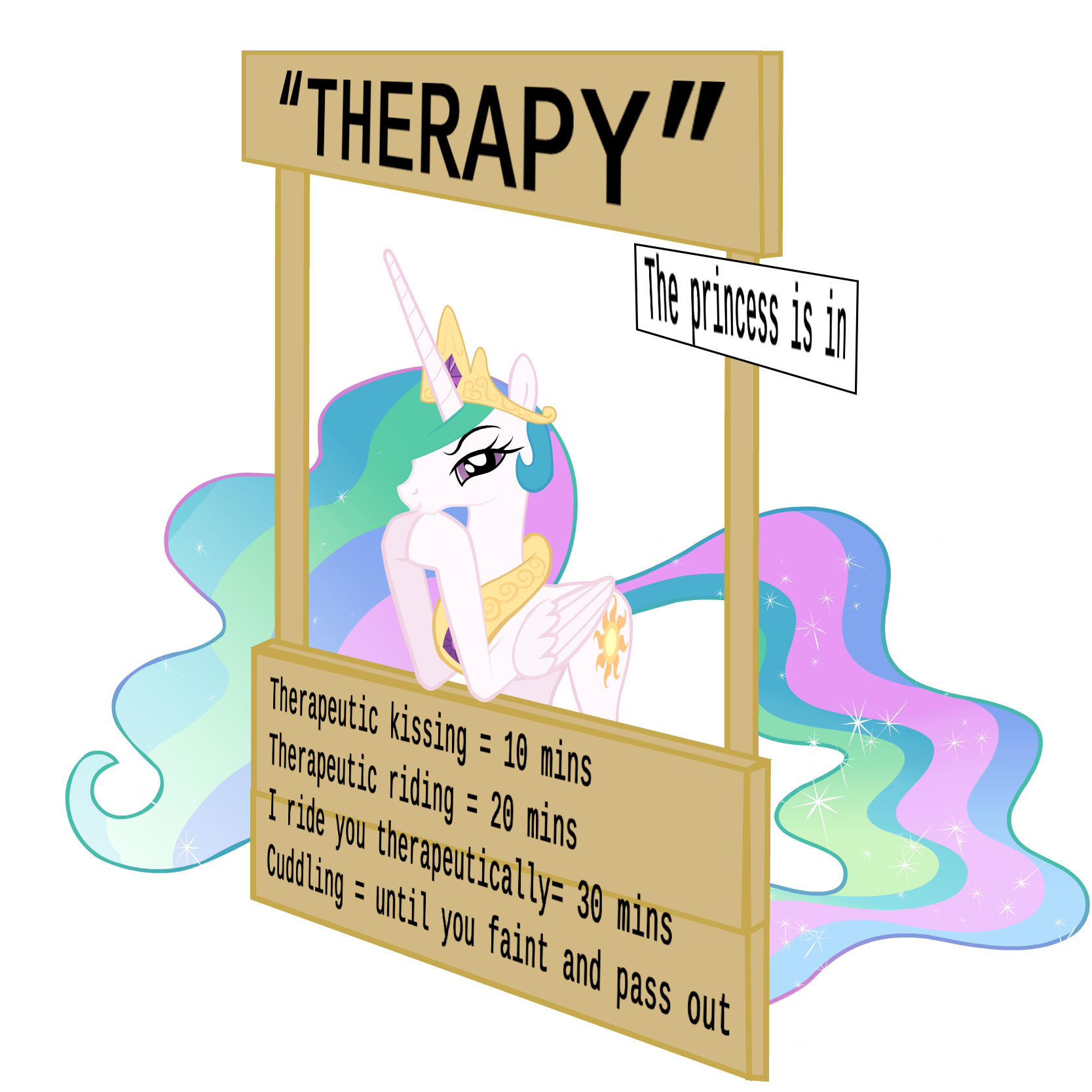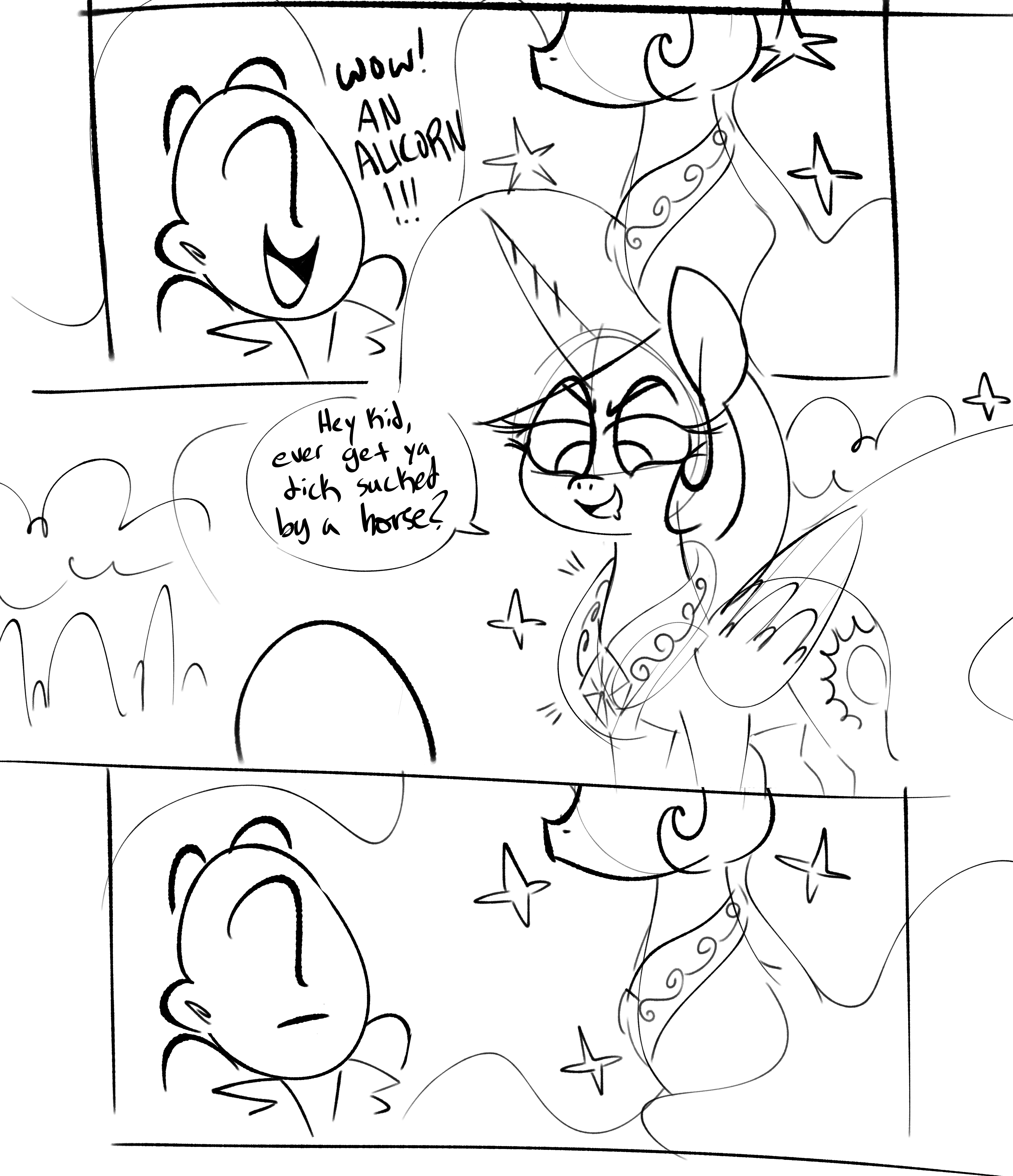 >>43059113>>43059150>*Scribble scribble scirbble*>*SCRIBBLE SCRIBBLE SCRIBBLE SCRIBBLE*>"UNF! MMH! OH! UHH! Yes Anonymous, buck me! BUCK ME HARD!">*PLAP PLAP PLAP PLAP*>Princess Celestia could barely think straight as Anon's cock stretched her winking pussy and his hips collided with her ass, the sound reverberating throughout the entire bedchambers.>Celestia regretted waiting this long to proposition him for this, this was the best sex she'd been having ever since the diamond dog, the zebra and the centaur triple-teamed her at the diplomatic meeting>Of course Anon would lie about it later, complain about it "not happening" and "fake news," yadda yadda yadda, but Anon's hard cock in the princess' marepussy suggested otherwise.>"Oh fuck, Princess, I'M ABOUT TO-">"Yes, DEEPER! DO IT INSIDE!">Anonymous lasted a precious few more thrusts before he released, his hips crashing against her big, cake-enhanced ass.>Anonymous dumped his warm seed into her as deep as his physiology would allow him to.>After what felt like an unconventionally long matter of about two or three minutes, the two sex partners regained their composure and looked each other in the eyes.>Celestia leaned in and kissed the human expatriate passionately.>"You can sleep in my bed with me tonight. Tomorrow will be a 'good morning.'" She winked at him>Dreams of further lewd escapades filled the Princess' head throughout the night, until her eyes suddenly shot open in realization.>"Shit, can a human get a pony pregnant?">"No matter, I'll figure that out when we get there."