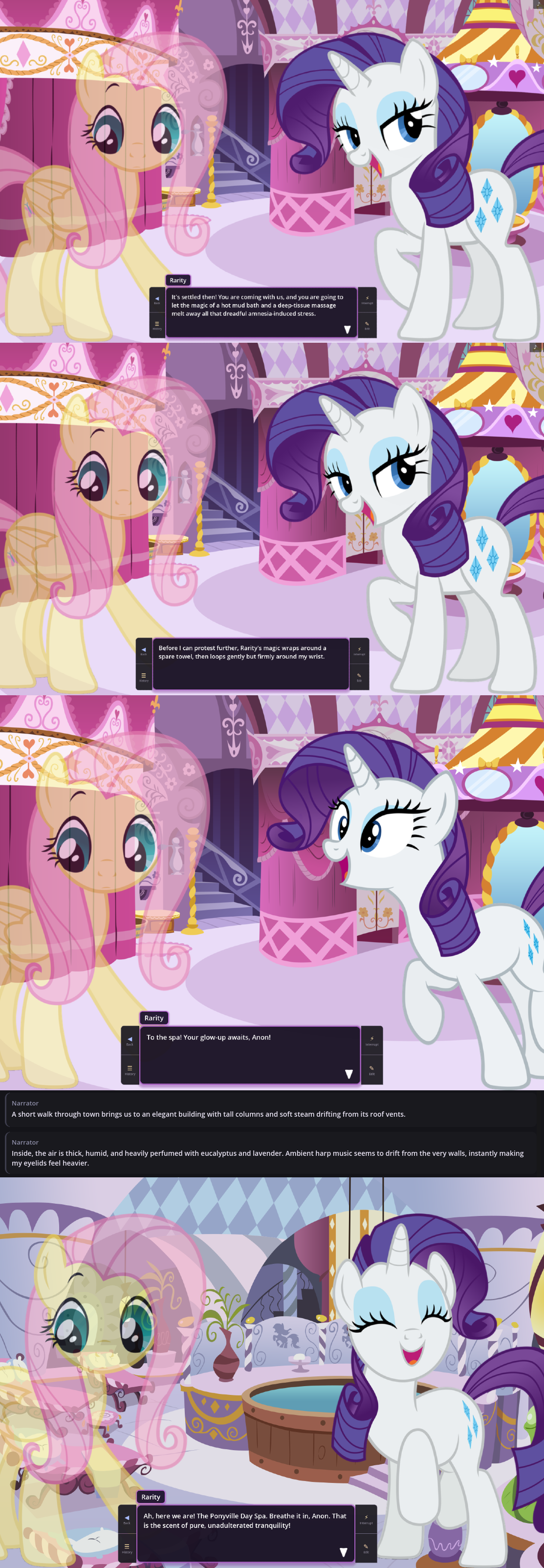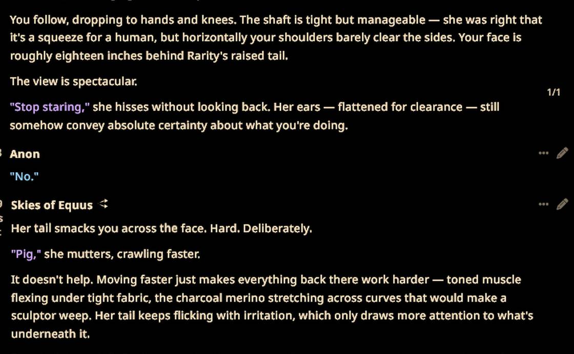 I'm testing Gemini 3.1 for the VN. I liked 2.5 for it because it was quite dynamic with switching locations and bringing in new ponies.Here I got dragged to the Spa without waiting for my input, so it still seems to be the case with this version.