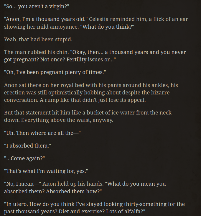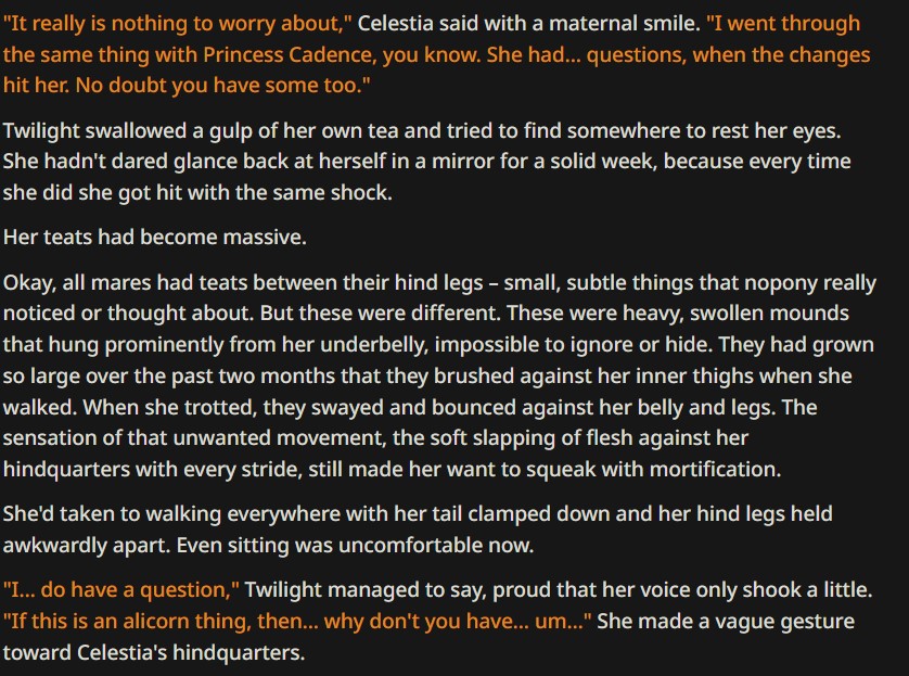 >>43068194She's a big mare, she can handle it easier. Besides, if hers was sized relative to her little ponies, she may as well be carrying twin fillies from that description I imagine.Did you and the AI continue that? What was your answer to her, kek