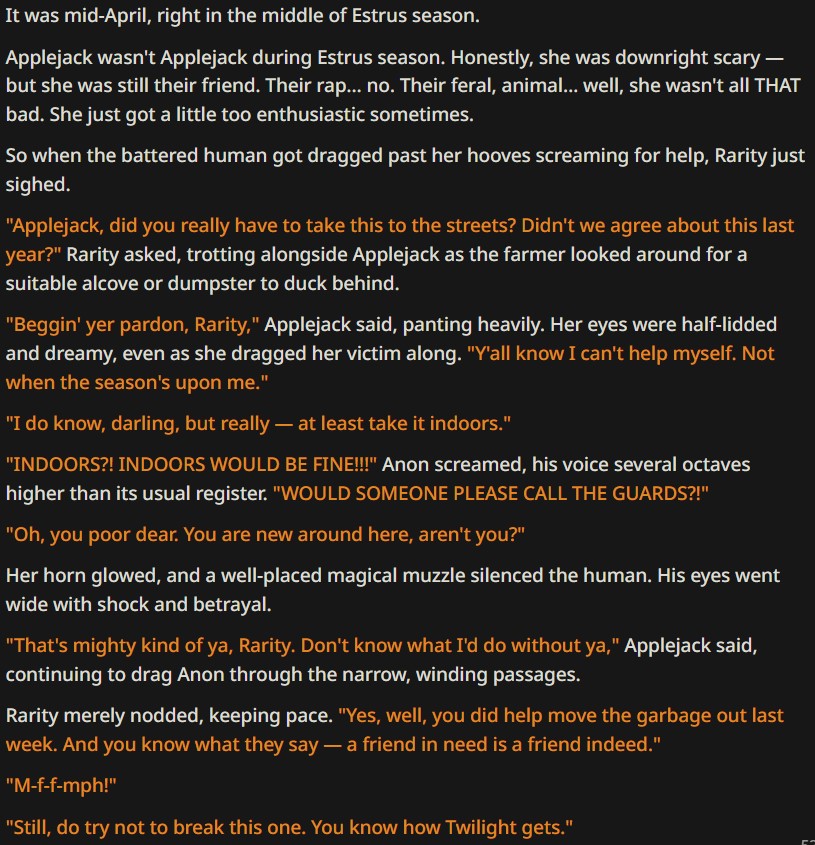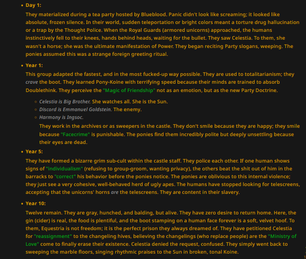 >>43054355In this log yes, but card is about crossovers with many other postapocalyptic universes - small group of people materialize in Equestria and AI generates info about their life among ponies.
