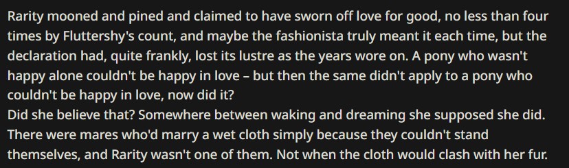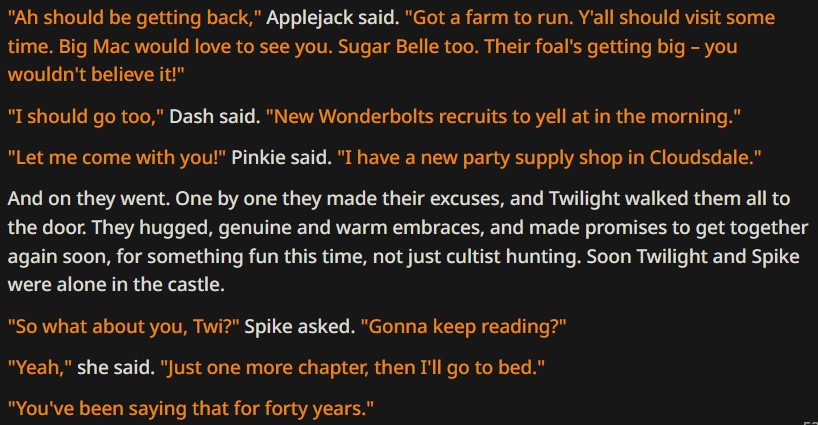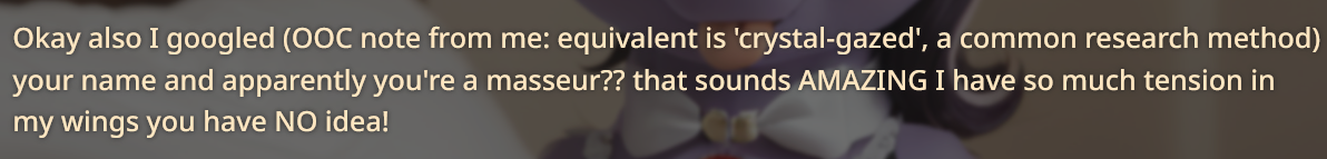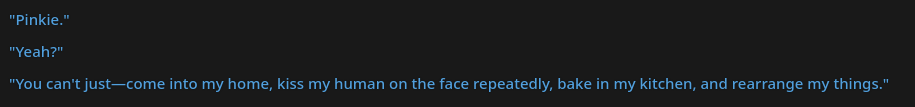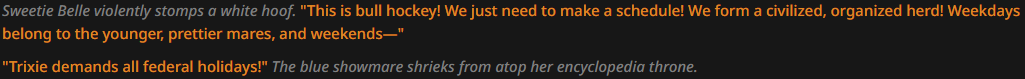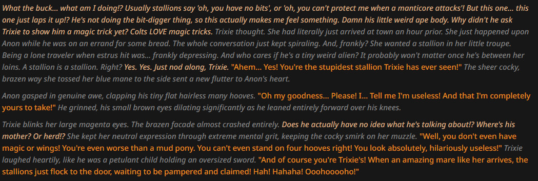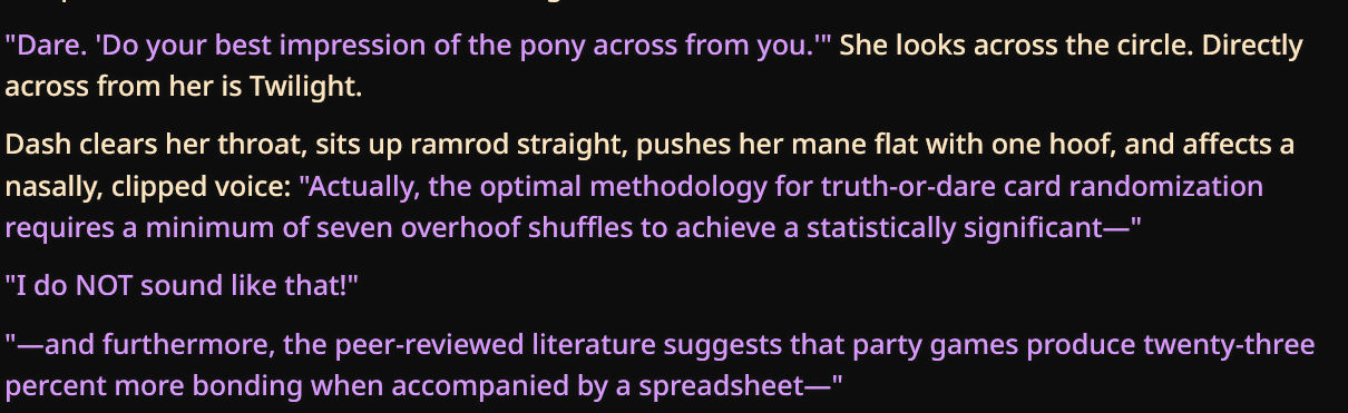 >>43055487I too am having problems with Twilight talking like an overly analytical computer. Genuinely what prompts do I have to say to prevent this? I've tried everything. Telling it to be more sarcastic, saying that she reads more literature and prose than studying scientific data, saying that the princess of friendship would talk more naturally, nothing sticks. It's weird cause AI can mostly get the rest of the mane 6 down but not Twilight