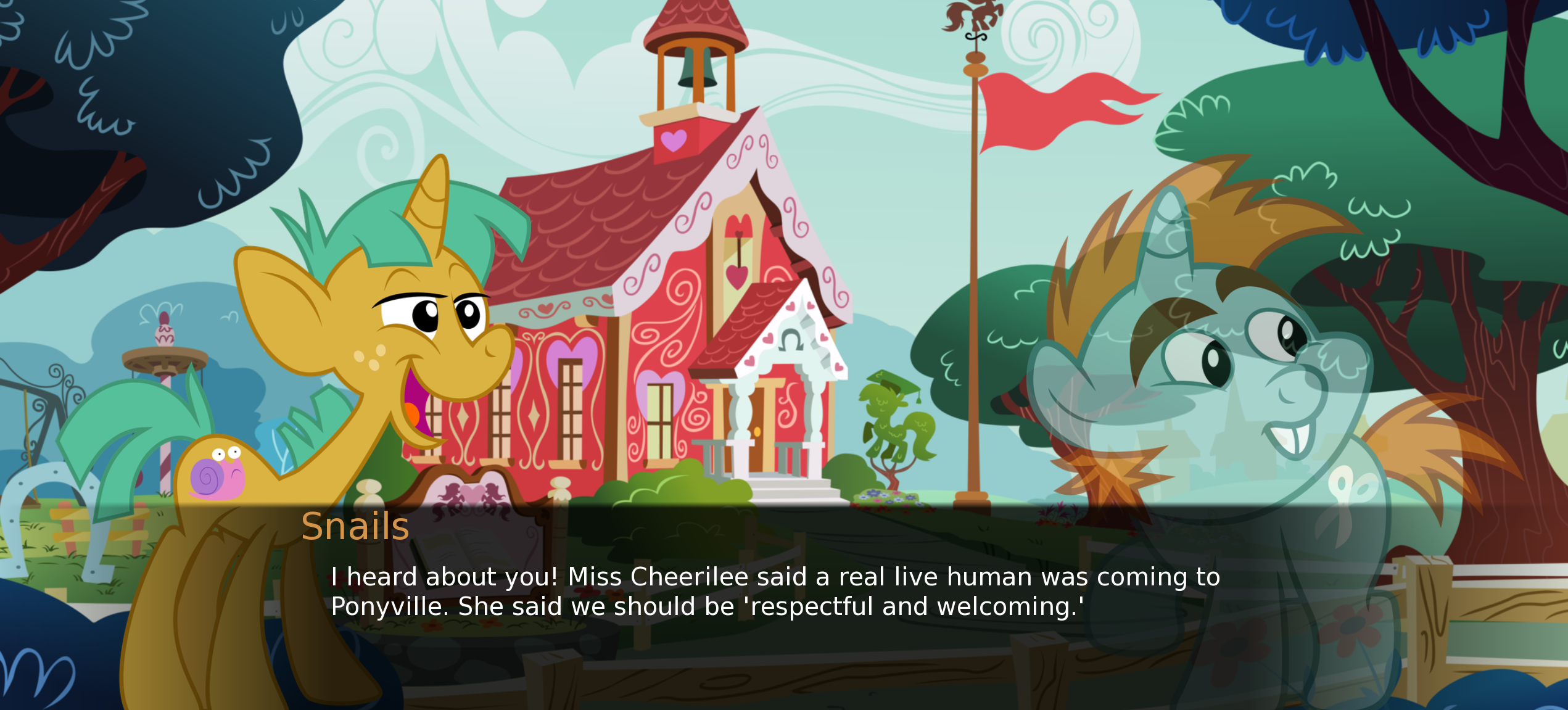>>430539071) Not the same, but we have Shutterbug if you want Chrysalis to be in Ponyville without being spotted.https://equestrai-ponyponyparadise.neocities.org/characters2) Otherwise, go to game/CoreCharacter and copy her folder -> Paste in CustomCharacter -> Copy a character.json and schedule.json from another character and paste them into her folder, then modify them with her own ID (something like "Chrissy").Here is the folder if you want; just put it in CustomCharacter:https://u.pone.rs/dcuuixaq.zip