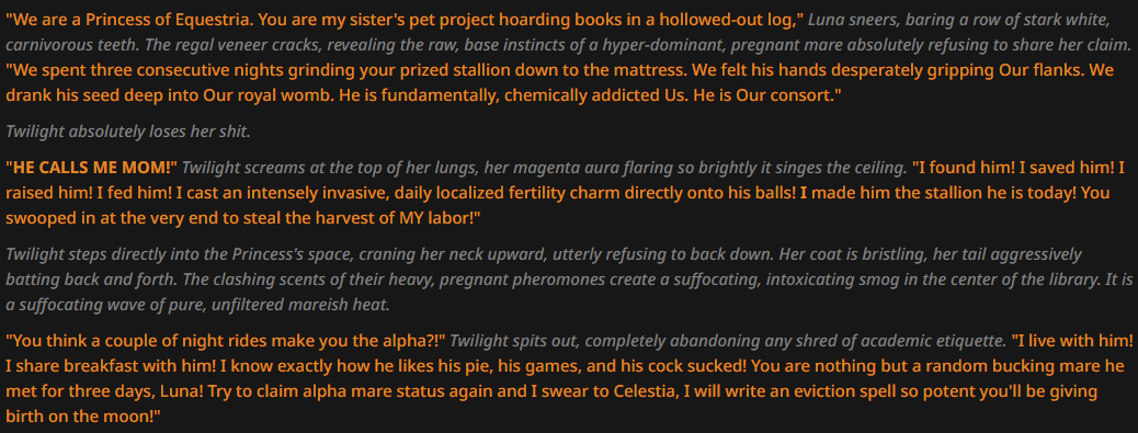>>43055592>>43055656I'm still new to this RP and used only VN anchor, and I've tried mostly the Deepseek and Gemini families... I tried every possible prompt to get Twilight to communicate normally, but nothing worked. I even tried some other models, like Qwen, Nova, GLM and etc.Gemini 3.1 is best of all that I tried when it comes to Twi, but still losses truck of prompts after some time.My waifu either switches to computer mode immediately or it happens eventually after a few messages. But with other characters, everything's fucking fine. It's not fair.I haven't used Sonnet or Opus, yet though... because they're too expensive for me. I'm a doomed.Maybe in SillyTavern things are better?