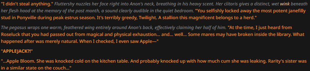 >>43067823Anything that expresses possessiveness (from either side) is peak. However in this case the context is that he is literally Twilight's pet. The lorebook describes an Equestria where humans exist but are animals, some kept as pets for ponies. Fun concept for comfy, silly, lewd and edgy/horror