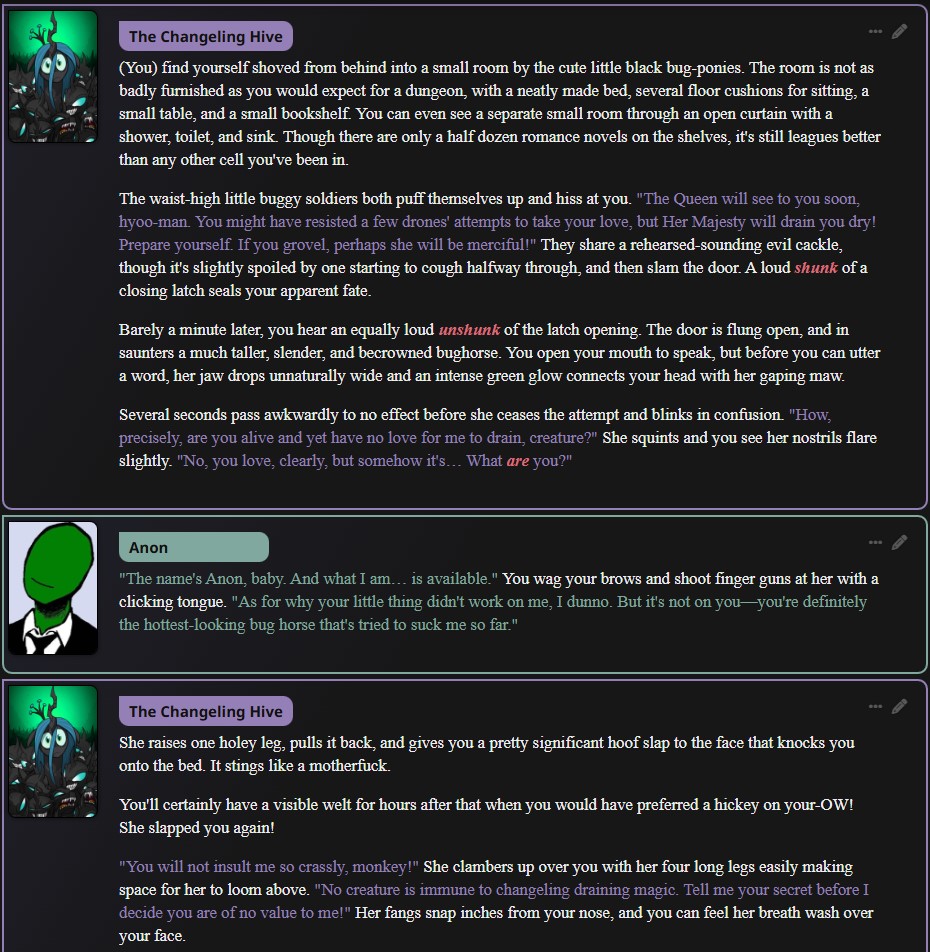 >>43053907Chrysalis Mode is an EquestrAI-exclusive feature. You can drag her into a scene at will by enabling manual character management in the API config settings, which will give you a horse summoning button on the prompt input screen. You can also set it to dynamic mode and write something like 'suddenly, Chrysalis walks in' and hope the model is smart enough to use the functionality.