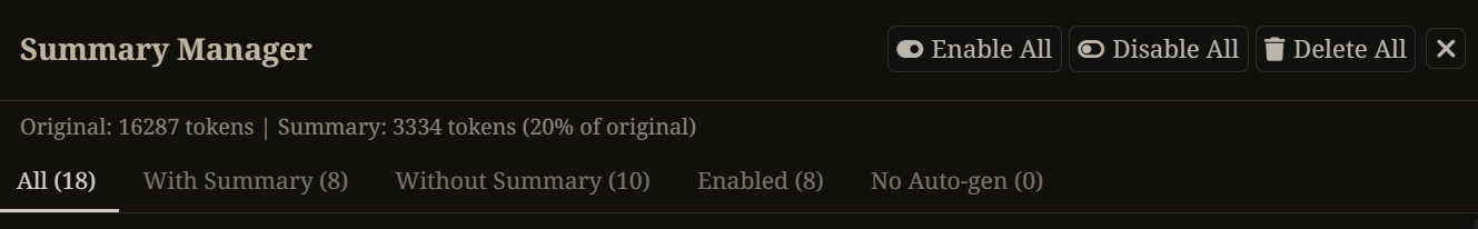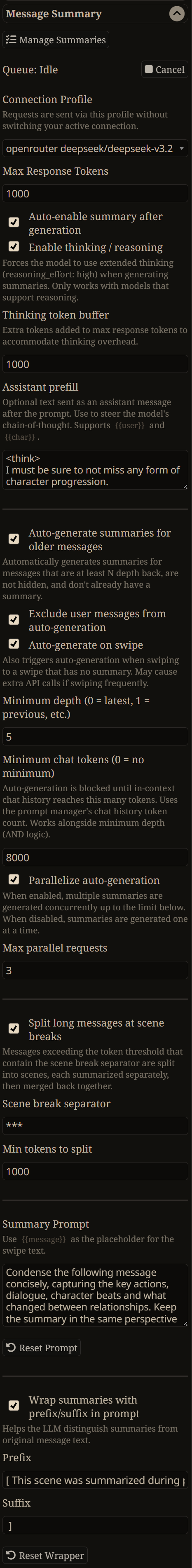 >>43068811>that the summary would replace the current chat's chat historyIt doesn't.>I gather from your replies that you're in fact meant to start a new chat, right?You can if you want, or you can hide messages like >>43068767 said, or you can just continue normally and let your context limit just remove the old messages as long as your summary is placed at something like depth 3–4. See what works best for you or the model.To see what depth means:https://desuarchive.org/mlp/thread/42810558/#42822482