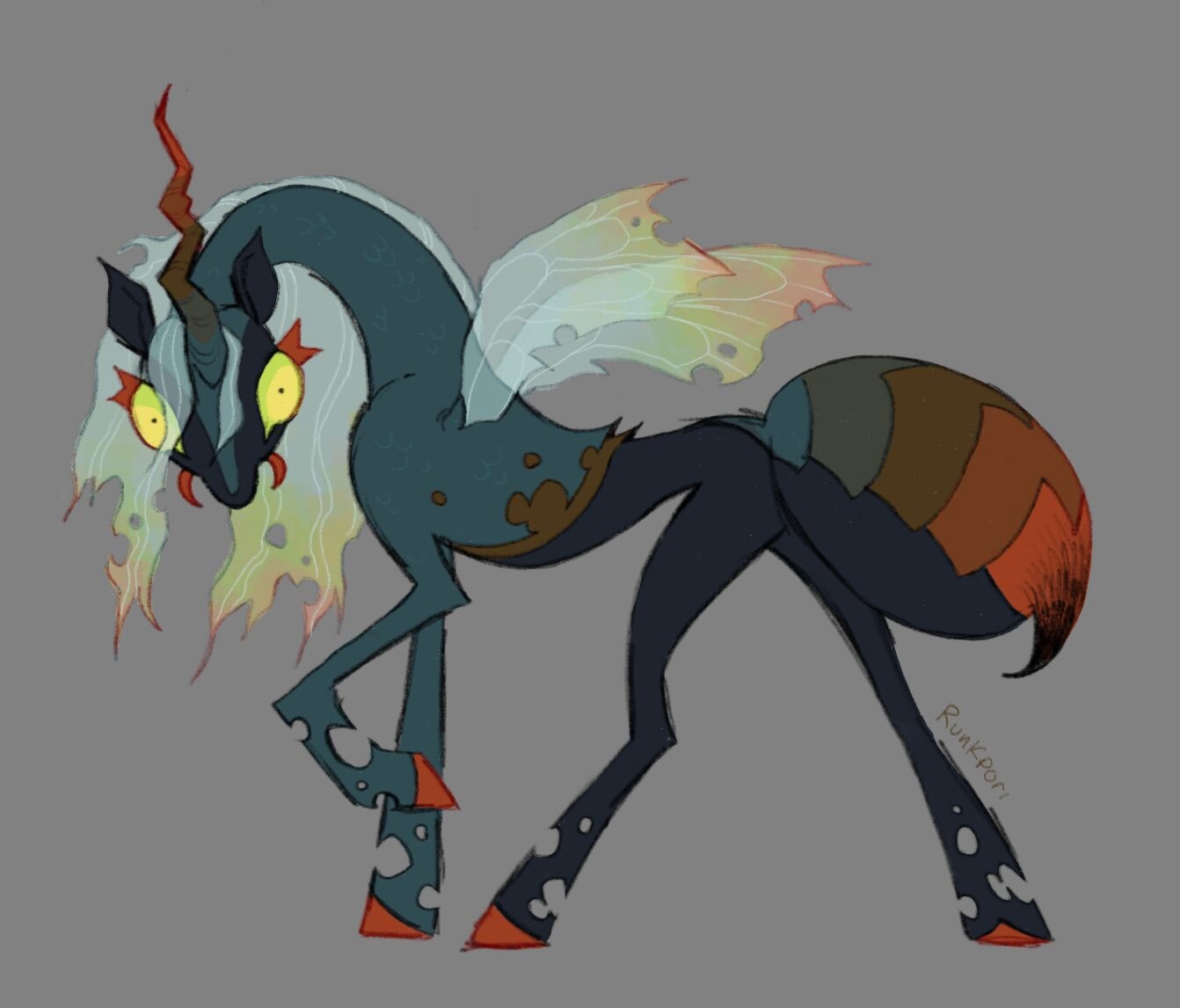 >>43059496I like to think Changelings are literally 100% just giant insects biologically. Eons ago, they did not even look similar to Ponies. They were just bugs. But they feed on love, and therefore a Pony is clearly the most obvious choice as a Changeling's primary food source.And over many generations, Changelings slowly began to mimic the Pony shape via natural evolution. (Y'know, kinda like those spiders that evolved to be shaped like ants so they can infiltrate better.) This is because it takes less energy/effort to transform into Ponies if your true body is already similar to one. Then you don't need to change as much, so you don't waste energy. You maintain the disguise more easily.In theory, there could also be isolated groups of Changelings who adapted to resemble say, Griffons for example, as their true/default form. Griffons are not quite as loving, but competition with other hives for example could cause small pockets of the Changeling race to adapt to the size, shape, and characteristics of Griffons to make it easier to prey on them specifically. Like how bats are nocturnal to avoid competition with birds.