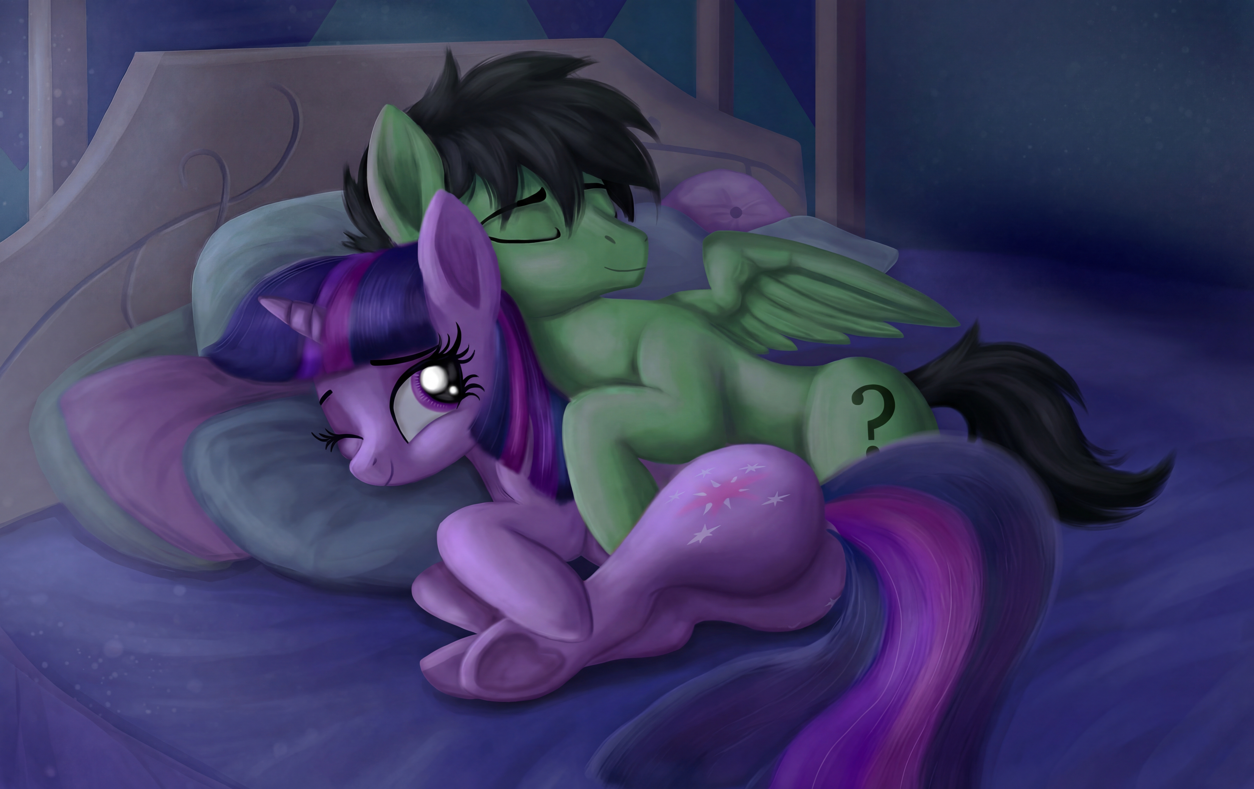 >>43124564"I have plenty to be sorry about, Twilight.">Twilight fidgets in her seat, but offers no immediate response."The real question is: can you forgive me?">Derpy sits back in her seat and utters a small burp.>"Those were some yummy muffins." She scratches her chin. "Hmm, yummuffins?">Derpy smiles at you, and then at Twilight.>"Did I miss anything?" She asks.>"I was just apologizing to you about what happened in the bathroom." Twilight reminds her.>"Ohhhh...." Derpy licks her lips and smiles. "It's okay Twilight. Everypony does a bad, sometimes.">Twilight smiles ever so slightly.>Perhaps this evening can still be salvaged.>Derpy yawns and rests her head on the table.>"I'm just gonna rest my-ZzzzZzzzZZZZZzzzzz.....">The mare falls asleep faster than you can say "Ticonderoga".>That is, if you could SPELL "Ticonderoga".>Derpy softly snores as Twilight grabs a blanket from the cloest and carefully drapes it over her.>"Hmhmhmhmmmm!" Twilight softly chuckles. "It sounds like somepony enjoyed my baking.">Now she's starting to sound like her usual self.>Twilight clears her throat and sets the mug down.>"Alright Anon, I'll forgive you on one condition." >You raise an eyebrow."And what would that be?">Twilight conjures a notebook out of thin air.>"Tell me what happened between you, Derpy, and this alleged 'evil' version of me.">Your eyes widen at the absurdity of her request."I don't think you can handle it.">Twilight raises an eyebrow, as if to challenge you.>You sigh in defeat and reluctantly begin to recount the misery.>How you eked out a living as a humble flour maker.>How you were rejected by Mayor Mare.>How you and Derpy first met.>Twilight listens intently, often pausing to scribble quick hoofnotes in between sentences.>You wait for her to finish writing and continue to explain it all.>How Queen Twilight became obsessed with you.>How Derpy was violently incarcerated for "treason".>How Queen Twilight killed the alicorn princesses and took their magic for herself.>The further you dive into the tragic story, the more Twilight's curious smile fades.>You reach the part where Princess Cadence saved your lives at the last possible moment.>Twilight stops writing in her notebook to cover her mouth with her hooves.>"N-No!" She tears up. "Not Cadence...">You grimly nod your head. >"Without help from Princess Cadence, Derpy and I would be deader than disco.">"Disco?" Twilight cocks her head in confusion.>Oh right, disco hasn't been invented yet.