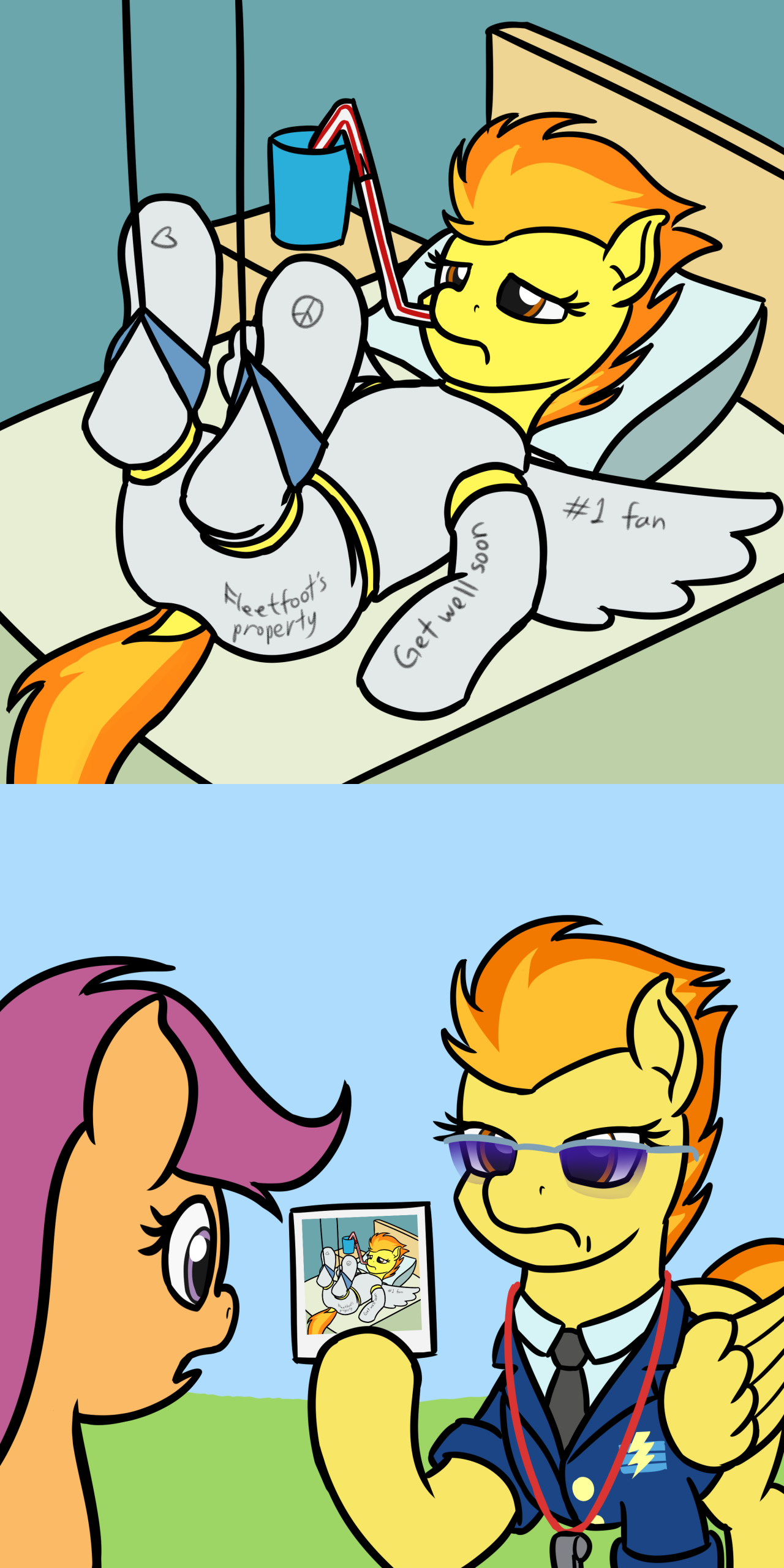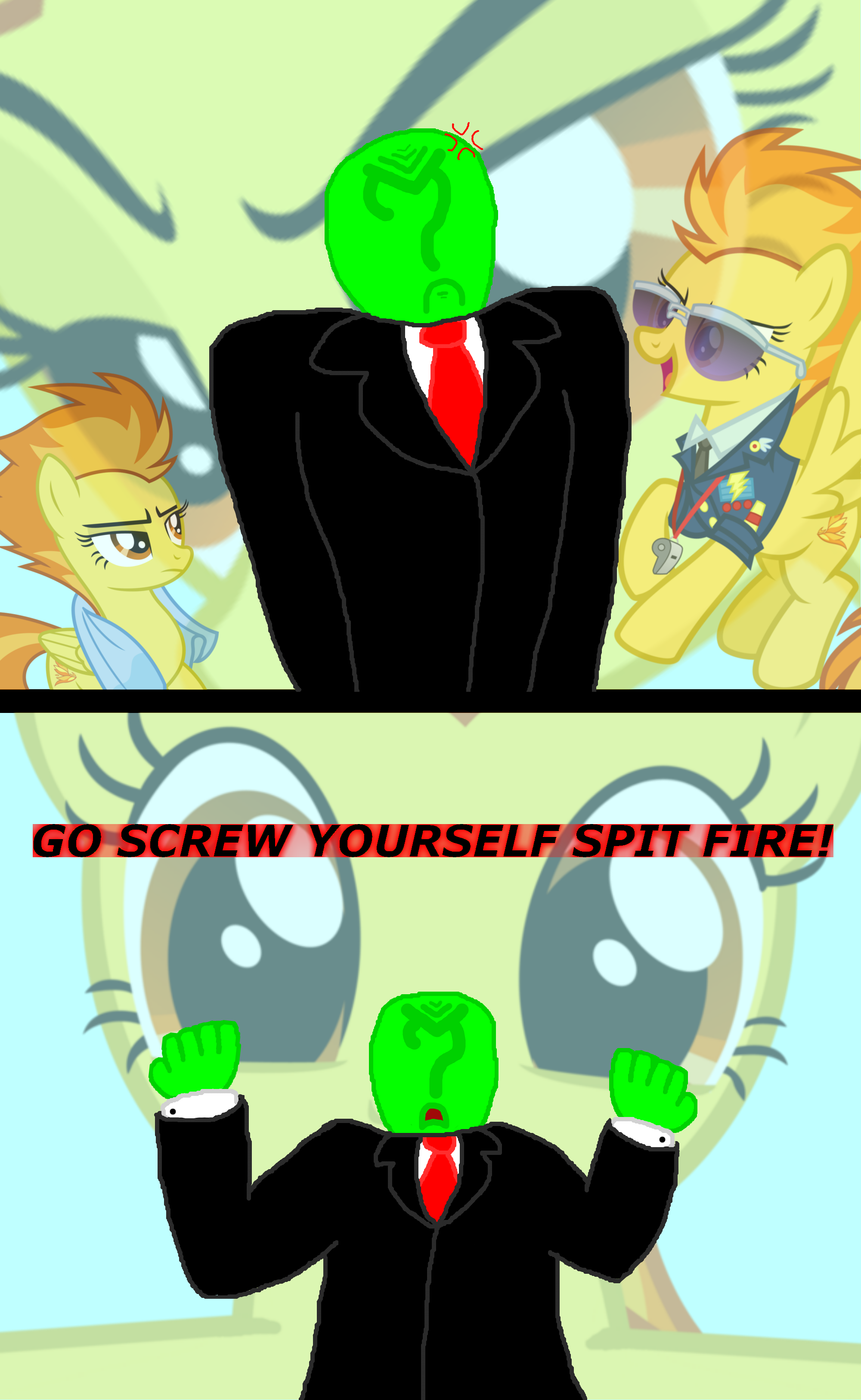 >>43133811>*She kisses me back to life*Wha->*Then she slaps me* and if you ever do that to me again, you'll wish you were dead, do you understand?!Did you kiss me?>It was mouth to mouth recus, don't you know how to do that? I do, I just. um anyways.... I didn't know you felt this way about me ma'am...>Call me spitfire dweeb.But you just said...>Don't question my orders anon.Alright...>Do you really think I'm beautiful anon?Absolutely.>What you said about me is true, I push people away. but if I understand correctly, so did you.... that was a long time ago...>But when you care about somepony, it's not too late to be there for them. Isn't that right?Yeah, I think so... >Then... hold me close anon... I need you to be mine, all mine.*We embrace as the wind shifts around us*>I guess I'm a real knockout huh? *she chuckles with a tint of pain*You sure are *I smile shyly*