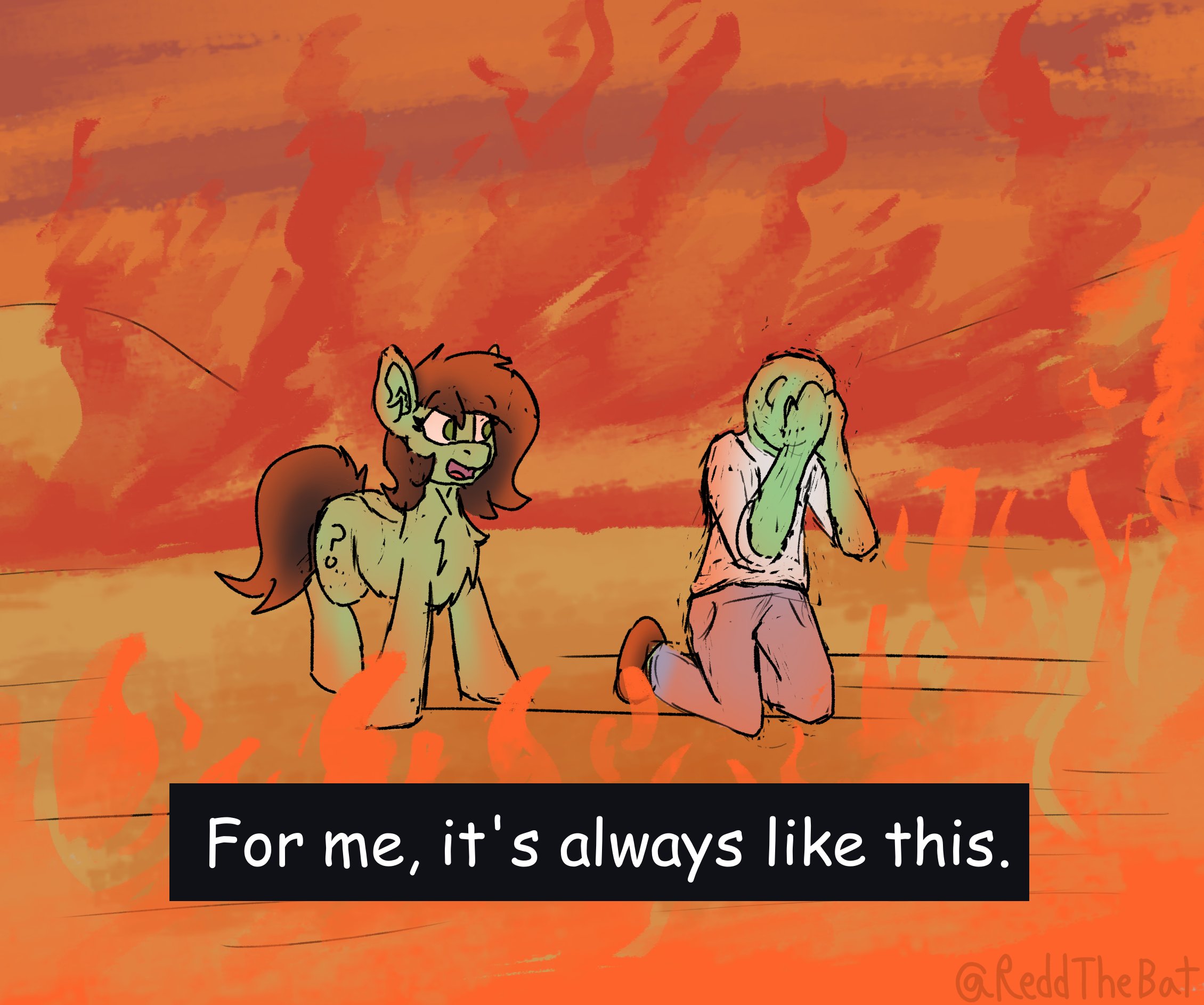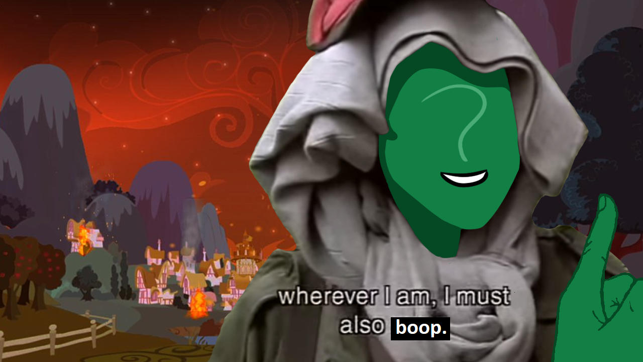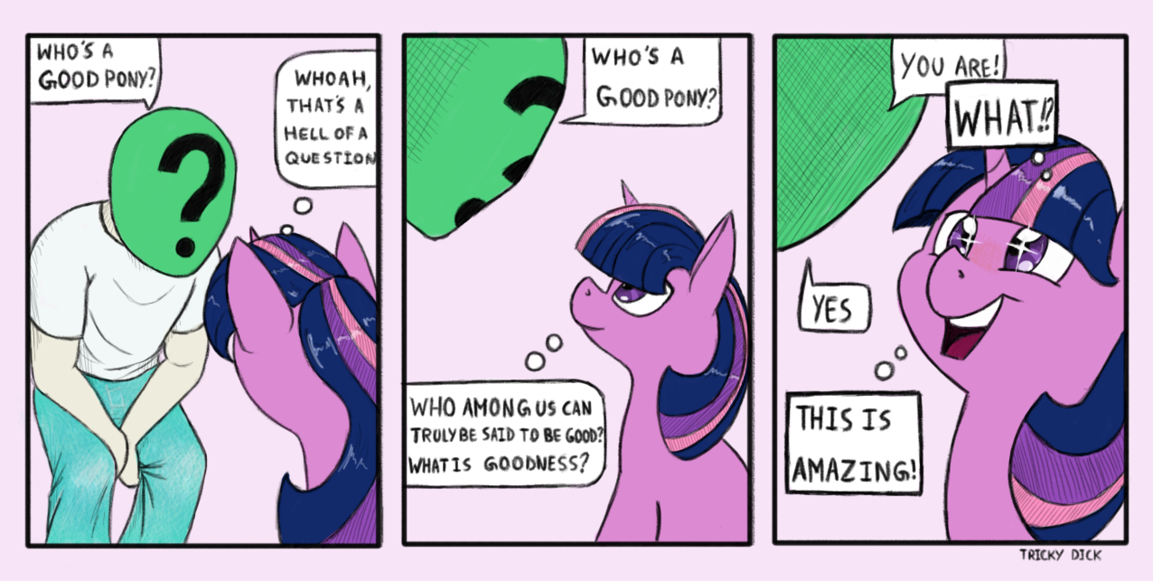 >>43093128>"So THAT'S what it means, doesn't it?">Be anon, who just slipped up big time>Gave away the gag after a great two weeks>But maybe you can still save it?"What? No, it doesn't, Twilight! It means, uh, I like you, my very good friend!">try to stifle a snicker>fail>"AHA! You're lying!""Oh come on, Twilight! It was funny. Even a boring bookhorse should be able to see that!">"Well, that nonsense ends now. As Princess of Friendship, I'm officially declaring 'The Finger' to be a friendship crime. If you do it again, there will be consequences!">Is that a thing?>Can she even do that?>...>She's not a real princess, she's too purple"Yeah, right, Twiggy.">Give her The Finger and moonwalk away>"Goodbye, my very good friend! Hahahaha!">"This is your last warning, Anonymous!">Please, what could possibly happen?>Friendship Crime, your ass>two days later, on the run in the Everfree:>>43092895