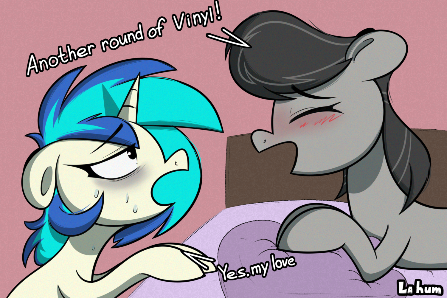 >>43151487Vinyl must lay some awesome pipe when drunk or Tavi likes taking advantage of her inebriated marefriend. Or both.