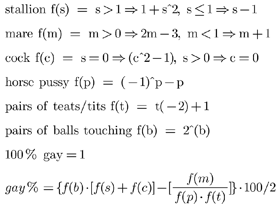>>43144947Well lets do the math on it to see how gay it is.stallion f(s) = s>11+s^2, s≤1s-1mare f(m) = m>02m-3, m<1m+1cock f(c) = s=0(c^2-1), s>0c=0horse pussy f(p) = (-1)^p-ppairs of teats/tits f(t) = t(-2)+1pairs of balls touching f(b) = 2^(b)100% gay = 1gay%={f(b)*[f(s)+f(c)]−(f(m))/[f(p)*f(t)]}*100so if we plug in our values for the variables we get383.3333%=({4*[-1+3]-(1/[-1*-3]}*100)/2so this scenario of two futa mares pressing their balls together is 383.334% gay, limiting to 6 sigfigsand if we compare it to a hypothetical two stallions pressing their balls together we get ({4*[5+0]-(1/[1*1]}*100)/2which gives us 950% gay, and if we compare it to a mare and a stallion not touching balls we get ({1*[0+0]-(-1/[-2*-1]}*100)/2which gives us 25% gayso two futa mares touching nuts is 566.666% or 2.47826 times less gay than two stallions touching balls and is 358.334% or 15.3334 times more gay than a mare and a stallion not touching ballsand just for fun, two stallions touching balls is 925% or 38 times more gay than a mare and a stallion not touching balls