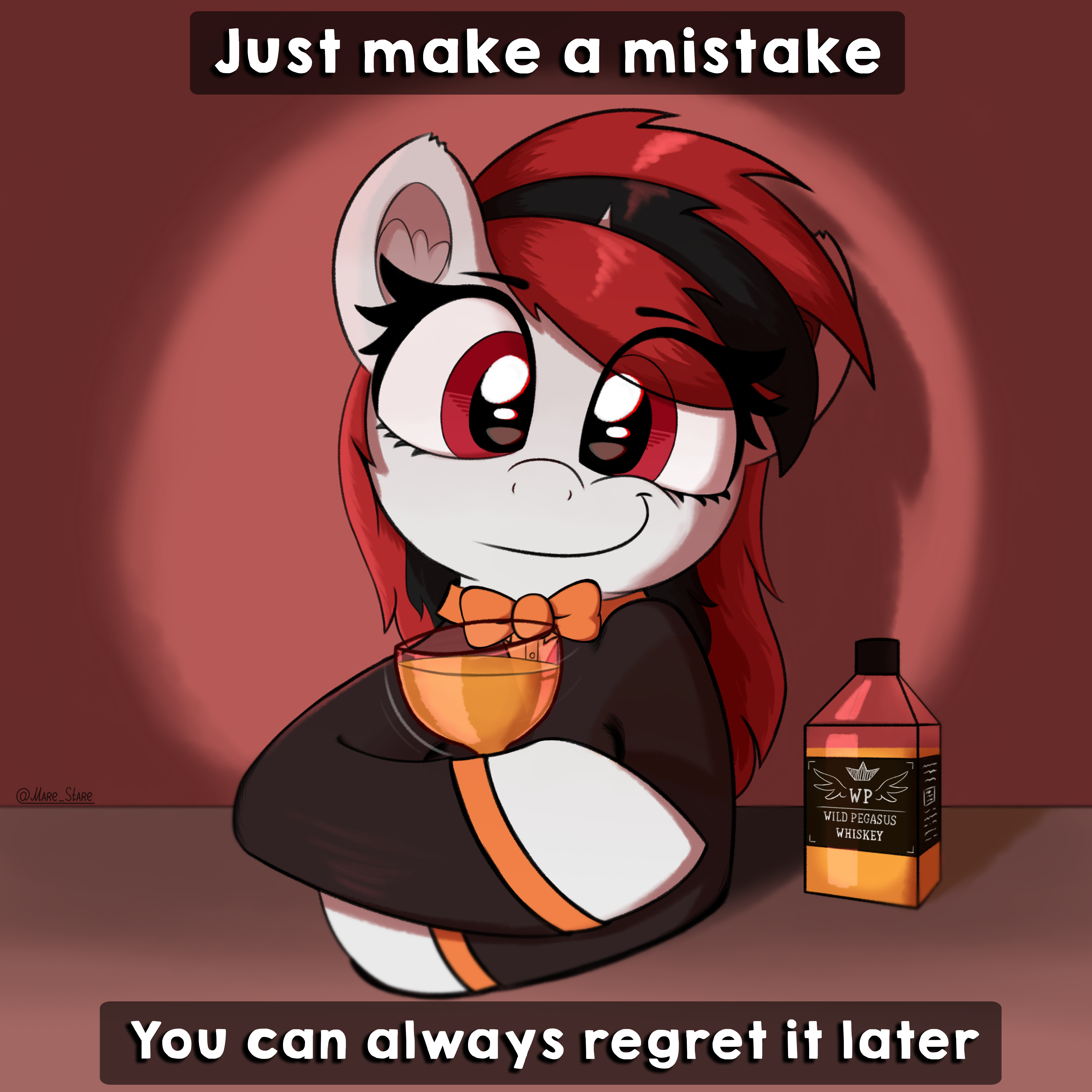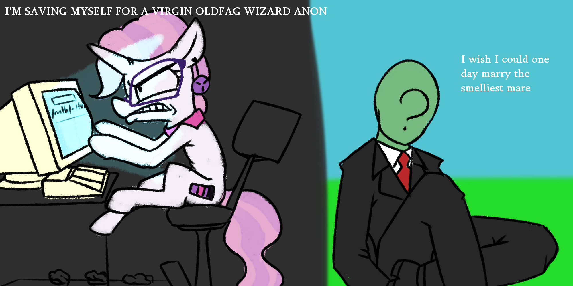 >>43094735>foreboding roomI should really stop referencing popculture things because you never get any of them.>Fully fledged pony in this contextAnother opportunity to twist his request! Just make him watch from the eyes of a pony from birth. The pony is a regular one with a fully fledged brain. Make him not being able to do anything but watch for the full lifetime of the pony. He did not say he wants to control it.>Is Discord is in control of Anon's proxy now?By this I meant something like preventing Anon from leaving. Or "simulating" what would Anon experience when he leaves, effectively keeping him a prisoner for some time. But on the other hand letting Anon out just enough to reconnect with the proxy and hijack it.