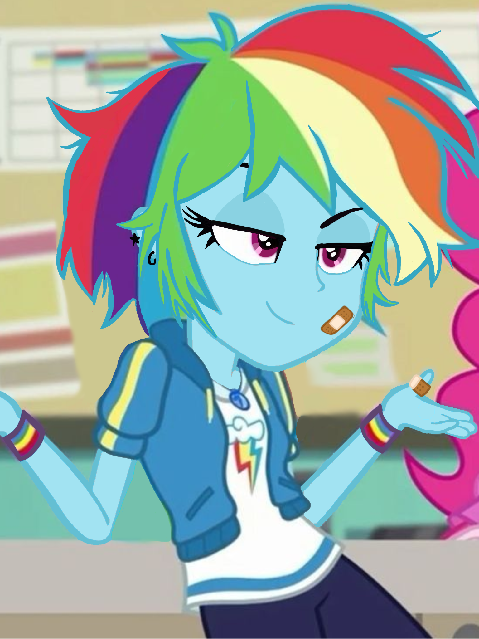 >>43124449Maybe play on her insecurity and the fact that she was bullied back in Manehattan. Taking on a masculine role at a new school and becoming a bully herself to avoid it. Could also just be something as simple as wanting to play on the male basketball team since they don't have enough people for a girl's one at her school. She was shown to be into roller derby in one of the comics, so I assume she's a bit sporty.