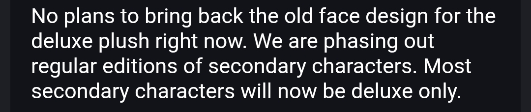 >>43128226It just sounds like a way to get more money out of people, since they charge extra for the deluxe ones. Luckily, I got all the plushies I want. The only new ones I'd buy would be more Trixies.