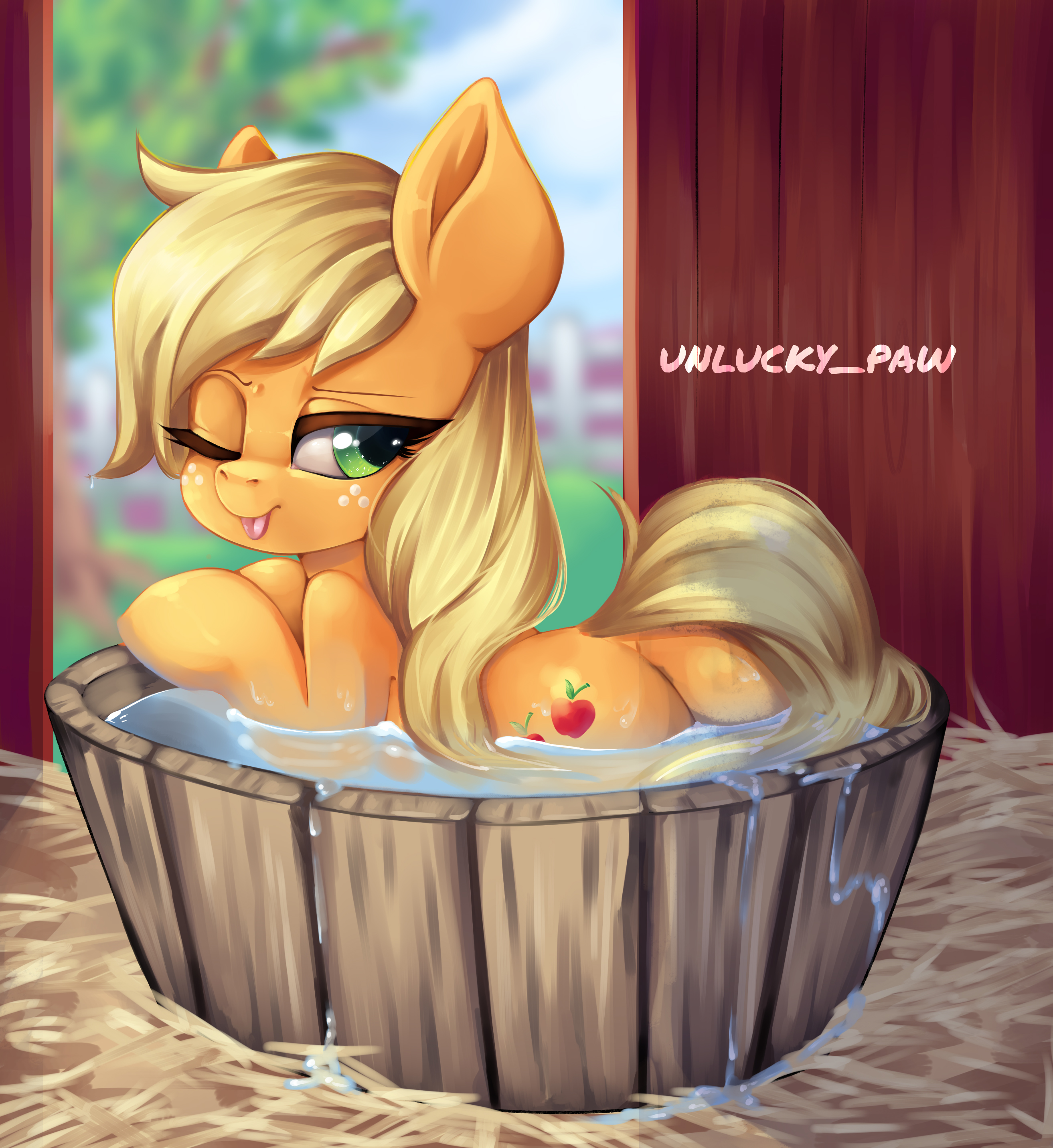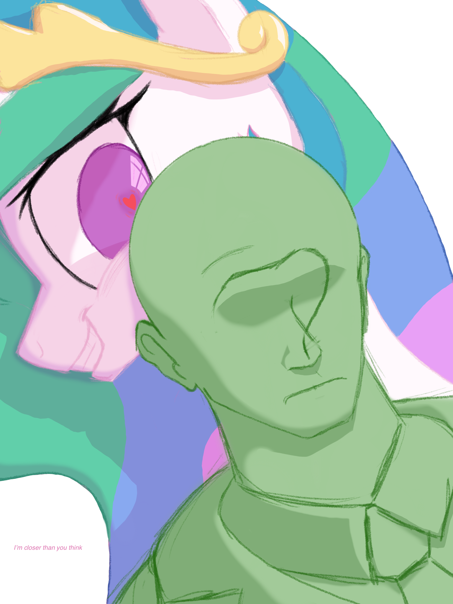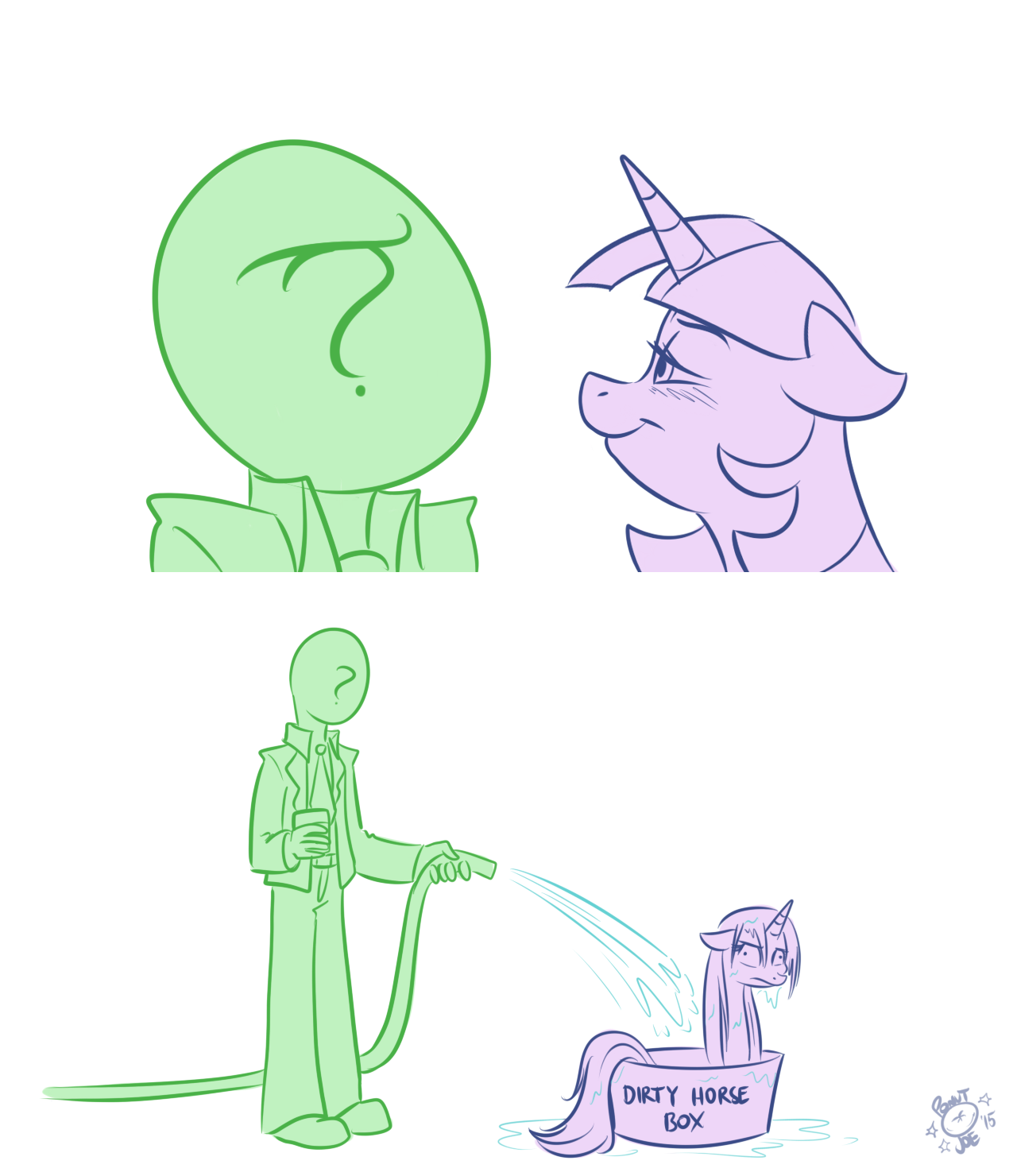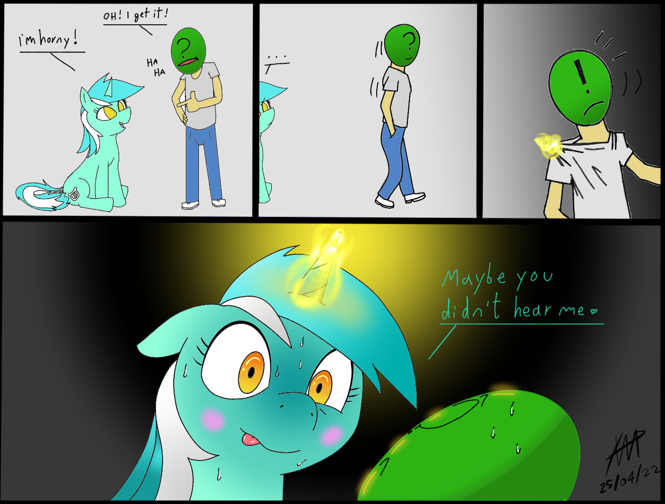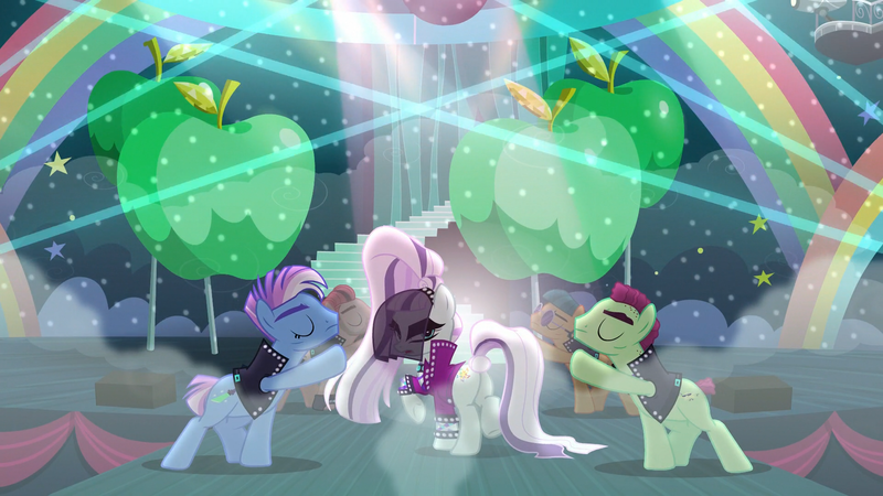 >>43107763>"You okay, Anon? You're looking mighty flustered there.""I'm fine.">"Are you sure? Cause you look a little green, and I mean more so than usual.""I just didn't know that the two of you were dating.">"Oh, we're not.""Really?">"Nah.""Well, that's good, cause--">"Not yet, anyway. But I think that that's about to change here pretty soon.""Really...">"You heard that song, right? The one that was clearly about me and her.""Are you sure?">"She invited me, she sang that song, and she was looking right over here the whole time she sang it. What else could she mean?""She sang about leather and jeans, you don't wear that stuff.">"Sure I do.""You do not.">"Well. I mean, I don't when I'm on the farm, cause I don't need the extra work of slipping my duds on and off when I'm out applebucking.""Which is every day.">"Yeah, okay, fine. I don't wear 'em all the time, like you, but I used to wear jeans a lot more back when me and her met at Camp Friendship.""I've never seen you in jeans.">"Well, I do wear 'em sometimes, and we got plenty of leather around Sweet Apple Acres. So there.""Has she been over to the farm a lot?">"Well, no...""Uh-huh.">"But what about that picture she's talking about? It probably has something to do with that photo of us singing and playing together back when we were fillies.""I know that picture.">"You've seen it? It's cute, ain't it.""You're not wearing jeans in it.">"Are you still on that? I'm telling you, that song is about me.""So you're saying Coloratura is your biggest fan?">"Her words, not mine."Right.>"I do think she likes me quite a bit, even if she doesn't go chasing me all around Equestria, like some of her fans do to her.""You're probably right.">"Course I am. And if I'm not, then some pony is gonna have to die.""Y-Yeah?">"Believe me, anyone who gets between me and my Rara, I'll chase them straight into Tartarus.""Yeah...">"Chase 'em until I get them down underneath my hooves. You ever see me crush a watermelon with these bad boys?""No.">"I barely even got to push down. And a head ain't actually all that different either--they actually both split open in the same way when you stomp 'em.""M-Maybe I should go...">Countess Coloratura suddenly appears, trotting in your direction>"Hey, Anon, did you like my song about us?">She rears up on her hindlegs and, wrapping her arms around your neck, gives you a big smooch on the lips>Pulling away, she notices Applejack briefly>"Oh. Hi, AJ. I'm glad you came too.">Her face when