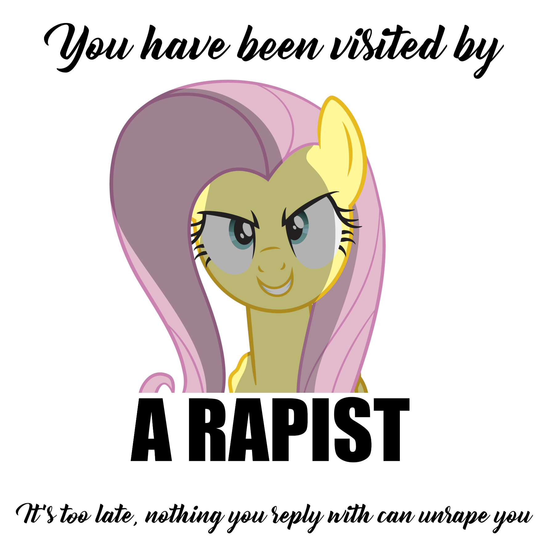 >What is Flutterrape?Flutterrape is a collection of stories about ponies trying and failing to have sex with Anon, the only human in Equestria. While the title implies that it is Fluttershy trying to rape Anon, others may follow in her stead and attempt their own versions of rape. There are different versions of Flutterrape, but most are light-hearted comedies about the ponies failing in their attempts to get into Anon’s pants. Just because your story has Anon in it, doesn't mean it fits in this thread. Check other threads (AiE, RGRE etc) about story content before posting.>It's been 12 years, how is this thread still alive?A perverse mixture of necromancy and spite.>How do I start writing?Use your imagination, you nitwit. Additionally, brush up on your grammar and abandon your standards.Writing Guides:Clever Dick's Tips For Short Stories -- https://ponepaste.org/1274Driverbang's Writing Guide -- https://ponepaste.org/1275Navarone's Writing Rules -- https://ponepaste.org/1276For additional information, lurk or ask. You could also check out the T:EM/P/O or /bale/ threads for further writing advice, unless they're dead.So many threads have died, but only Flutterrape has remained. We shall always remain. We are bound to the fate of the board as a lich is bound to its phylactery. Welcome, anonymous.////Masterlist: https://ponepaste.org/user/FlutterrapeGeneralAuthor List: https://ponepaste.org/1270FIMfiction Group: http://www.fimfiction.net/group/211640/flutterrapeRequest Bin: https://ponepaste.org/1268Thread Archive: https://desuarchive.org/mlp/search/text/Flutterrape/previous thread: >>43049343