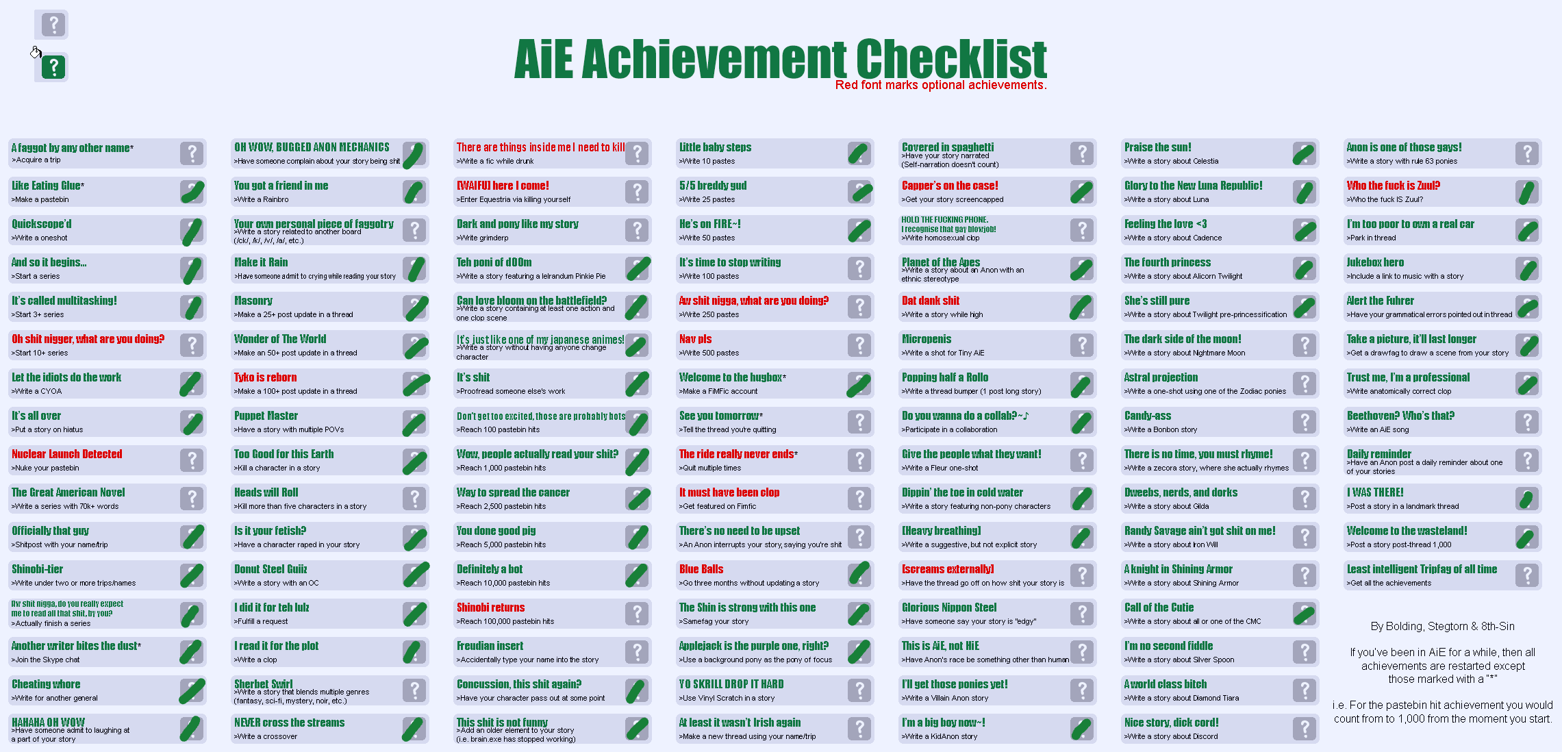 >tfw 'Someone reposts a green you wrote' isn't on the checklistgoddammit why did they make this so hard? I want my fucking bingoIt's just a shitpost, and you can only do so much when you're already halfway out the door to go to work, but two things bother me about it.Fluttershy should have had an accent, for one.>Double Decker inspects her new hire; she squints, focusing specifically on the mustache>"You said you were a part-timer.">"I'm from the veekend c-crew," Fluttershy stammers, trying and failing to disguise her voice by imitating the spa twins' accent. "My n-name is Sweepyshy. I do the sweepings."I also wanted a better visual descriptor for Dash's fucked up face.>She's out cold, snoring like a horse. Embedded in her bloody forehead are bits of broken glass which light up in the sun, like her face is covered in glitter.>>43107306I always thought she gets it from Dr. Fauna and Zecora and others under the guise of "I need it for a rare creature emergency" or something like thateither that or Fluttershy is Heisenberg>"Pinkie, we need to cook."