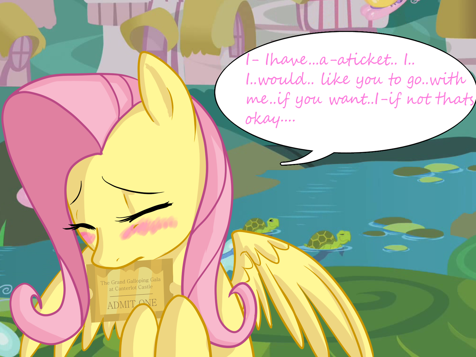 >>43116323>"I have A ticket">Ticket admits oneI don't think fluttershy has thought this through. Even if Anon did want to go he would be turned away at the gate as she went inside, or he would go inside while she waits outside.
