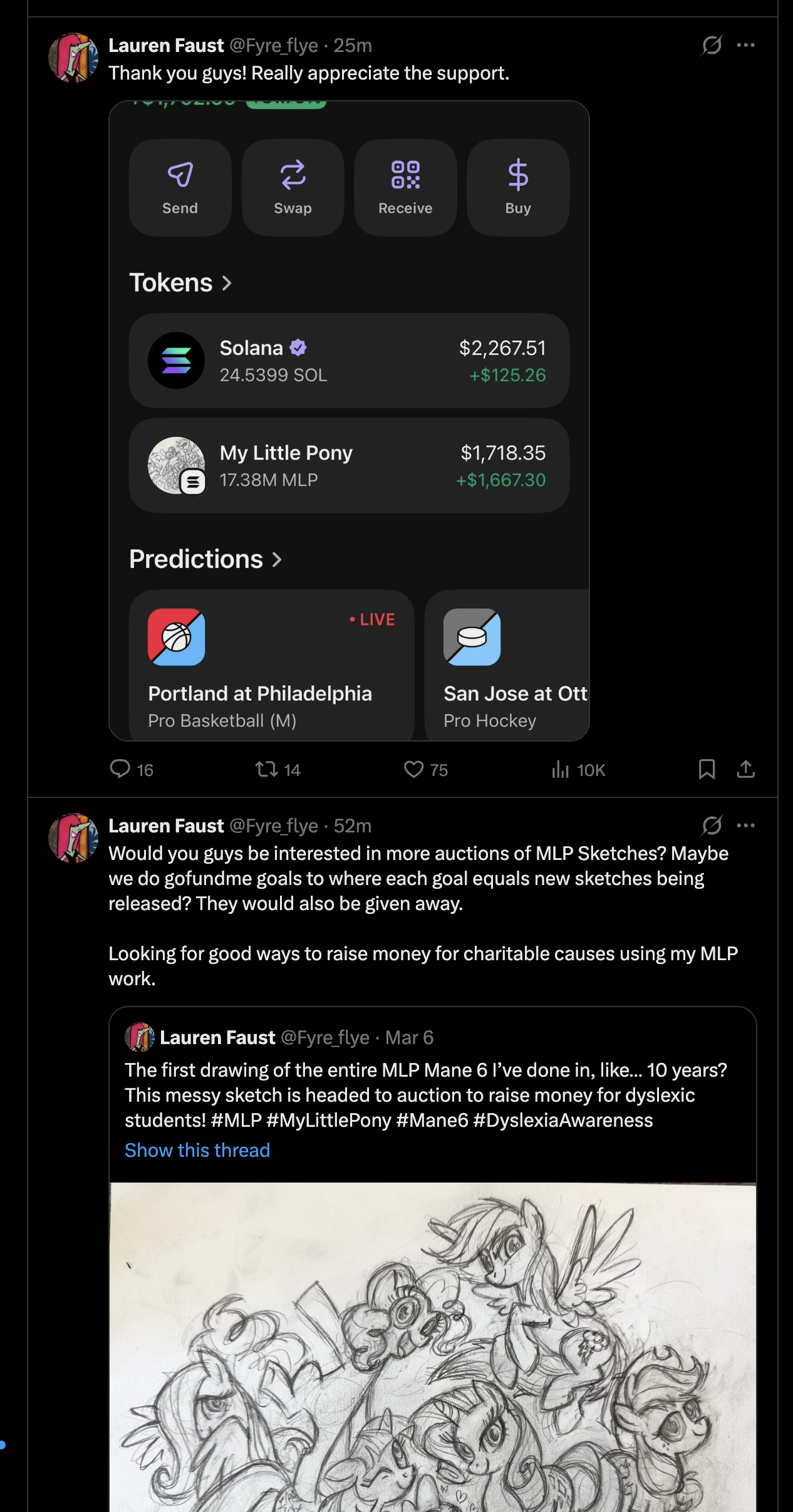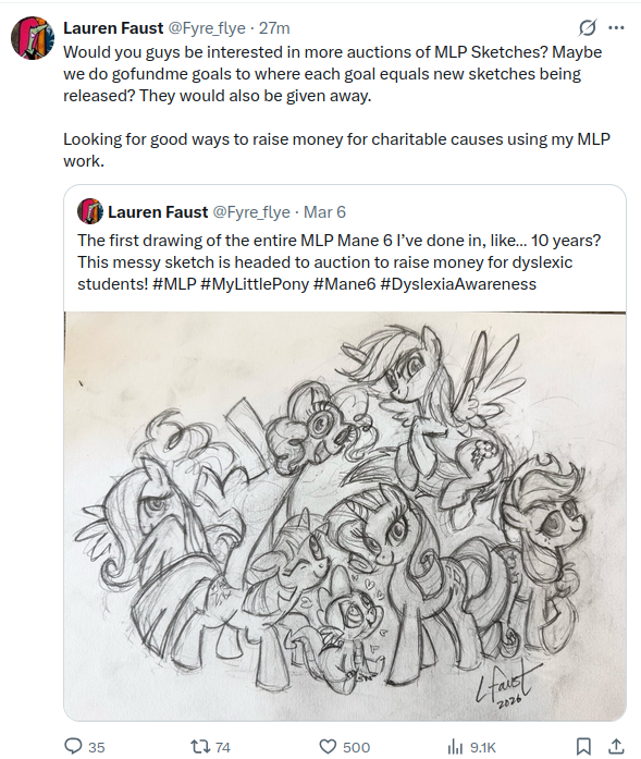 I don't want sketches in a vacuum, I want sketches based on her original vision of FiM. Why Rainbow Dash is brooding and where she flies away sometimes? In what form does "Twilight as Celestia's successor" take if not as a ruler? There was going to be more adventure-focused episodes and plot-focused episodes if not for constrains, what they would have been like?I feel like new sketches would be a nice subtle way to reveal all this without triggering Hasbro lawyers and twitter-brained-retards.