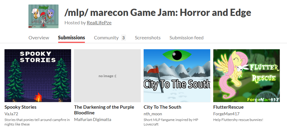 Some previous games from jams:https://itch.io/c/4098468/pony-games-from-previous-game-jams-click-to-see-allI'm still thinking about making a page to conglomerate all the Games from the JamsI'm thinking a backup, I'd redirect to the itch pages and archive some games that would’ve been deleted, shill board devs, maybe write some stuff about current pone games. A "next Jam" countdown maybe?Yay or neigh? Would you guys like that or would that be a waste of time?