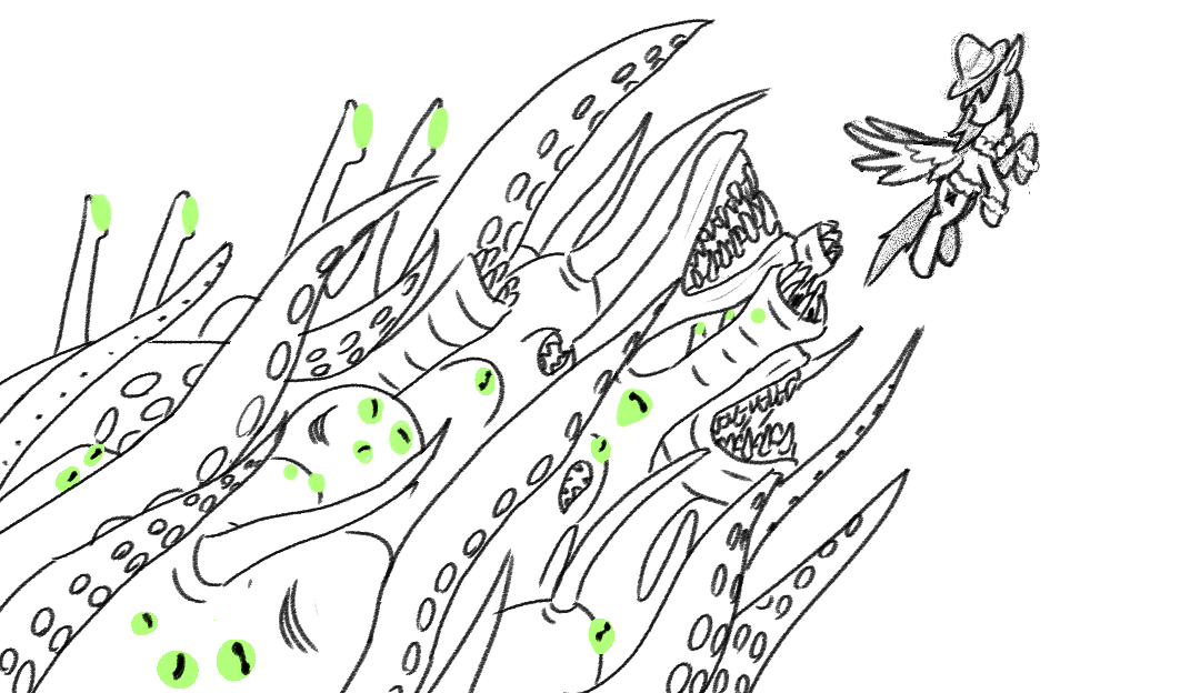 So I decided to try out the browser-playable ones tonight. (Not looking into the NSFW ones without further info, though; I don't wanna suddenly have clop shoved in my face.)First one I tried was the Celestia cake game, and I don't know why, but I kept cracking up over the Homer scream on the death image.Only Flesh is actually pretty good, though the magic gets depleted so quickly that any regen and efficiency upgrades are basically necessary to actually survive beyond level 2 (I burned through magic so fast I unironically thought the parasprites just had ridiculously tiny hitboxes at first).Decided to move on after I got to the first "true dark" level and died. (View was too limited, because even with a bunch of regen and efficiency, I still couldn't waste more than a second of magic on the light).Spooky Stories is cute and well-polished, though I felt like it was leading up to a main segment that never came, unless said segment was the mine one and I completely missed something in it. That said, I'd be interested to take another look if there was a content update to this one.Bunny Rescue... :(Was cute and simple, though did require some tricky precise movement. Not sure what all those spiky spheres were doing in the Everfree, though.Ultimately though, I don't think Fluttershy would actually be that scared of dead bunnies. She's fed fish to weasels; she knows the cycle of life. (Comics even imply she has a vore fetish, so...eh.Cheer and Warm has an interesting start (and yeah, I went and downloaded the local version for this one since the online one was having nasty graphical issues). Magic system is a bit clunky though; sometimes objects were practically stuck in place, and other times they moved super freely. My hand actually hurts a little from gripping the mouse so much. Not sure I did the drawbridge correctly, as I think I got it jammed against the log without actually slipping the log through the slot. So, yeah, got through the whole thing, and I'm still not sure I understand how the magic system is supposed to work. (Also discovered that prop surfing exists...)Regardless though, looking forward to more! (I'm a sucker for ponies in dire situations.)City to the South seems cool, but uh...is the game just supposed to end in an unwinnable situation? I literally can't exit the office building once the tentacle blob monsters spawn. Lot of potential with it though; I hope it gets fleshed out!Also, Bug:After you've been inside the auto shop and talked with the professor, you can't re-enter, as it just fails to load the professor's sprite and softlocks you.Overall I've enjoyed seeing everyone's games so far! I'll have to try more next weekend.
