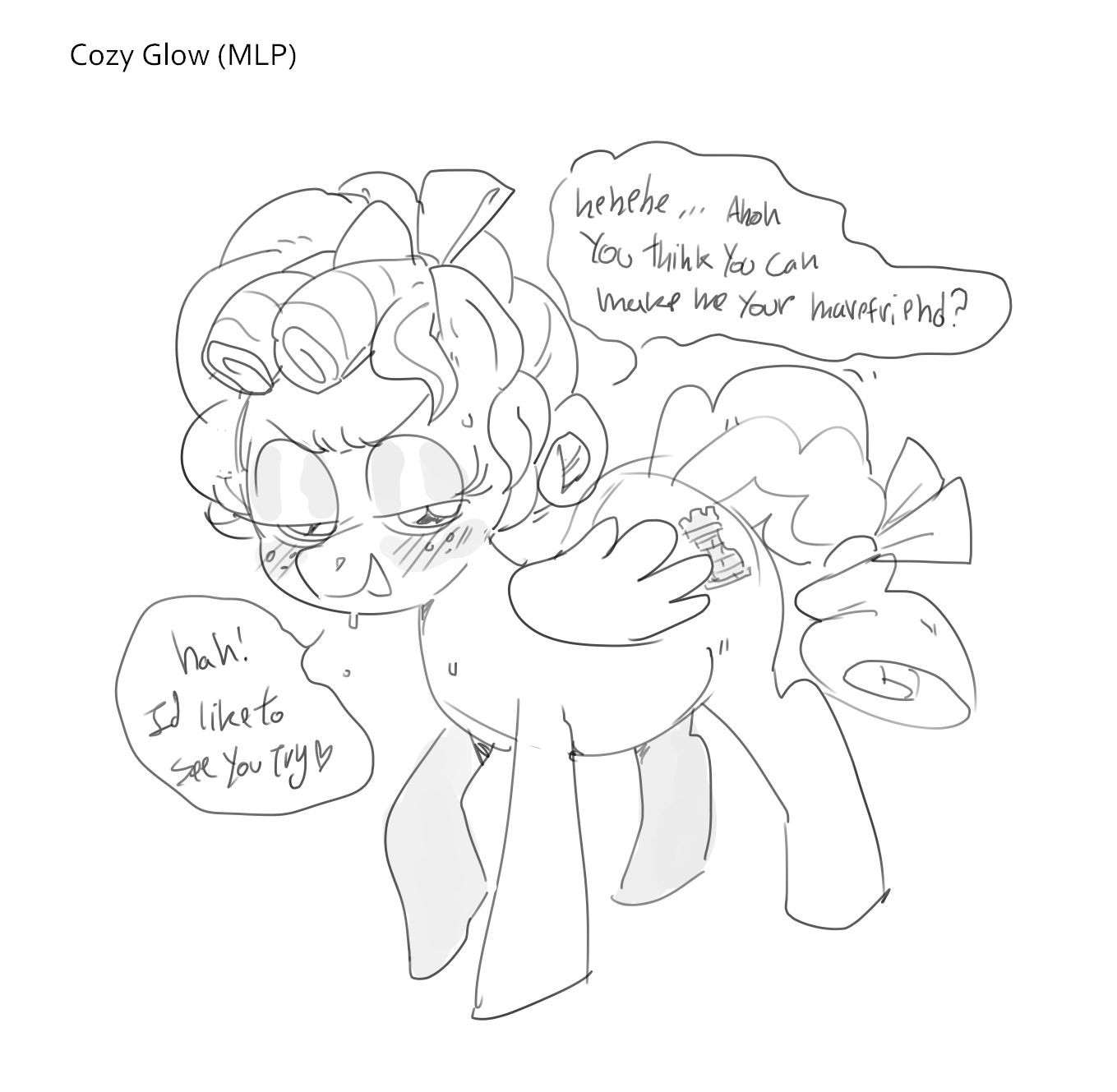 >>43164519these fillies have been drawn in the style (such as it is) of Legend of Zelda Wind TaktAs such, the faces are silly and exaggerated and look dumb, and Scoots has a beak.. so he wants her to be a woodpecker and peck on his johnson