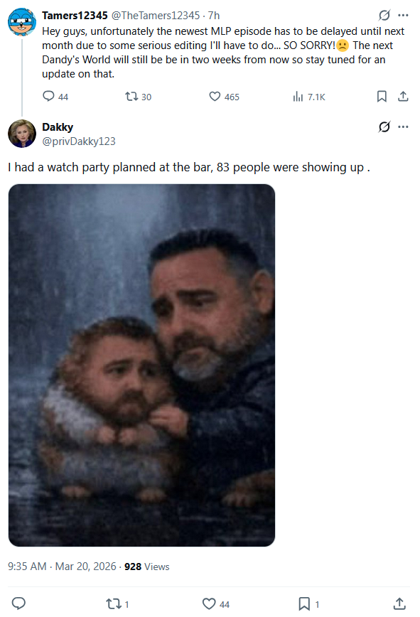 >mfw episode delayedOh man, this was going to be my first live Tamers video, i was so excited for it as well...Oh well, i suppose i have to wait to tell Tamers (Mare.) what i wanted to tell him...As for what i think happened, perhaps the answer isn't as bad as people assumed, maybe it's delayed simply because stallion didn't want to have an episode overshadowed by Digital Circus.According to last thread this has happened before and maybe that put a dent in their views last time it happened and they don't want a repeat?But that is only a guess.By the way, since it took so long for me to make replies and last thread was ending before i got a chance to i will be replying to certain posts last thread here.