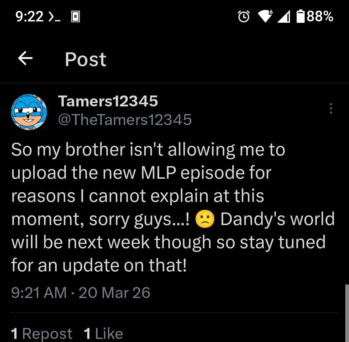 You know I’m not going to go full doomposter over a two week break but if Tamers ever did stop making videos for whatever reason he would just spontaneously leave without a farewell word or a grand series finale. Look at how he ended Sonic Underground, one day he just stopped the series with an average episode and that was the end of it.