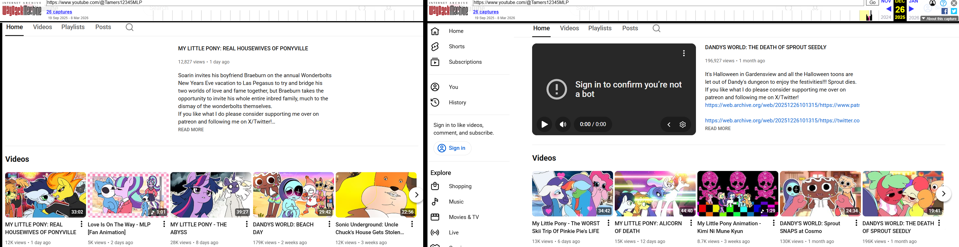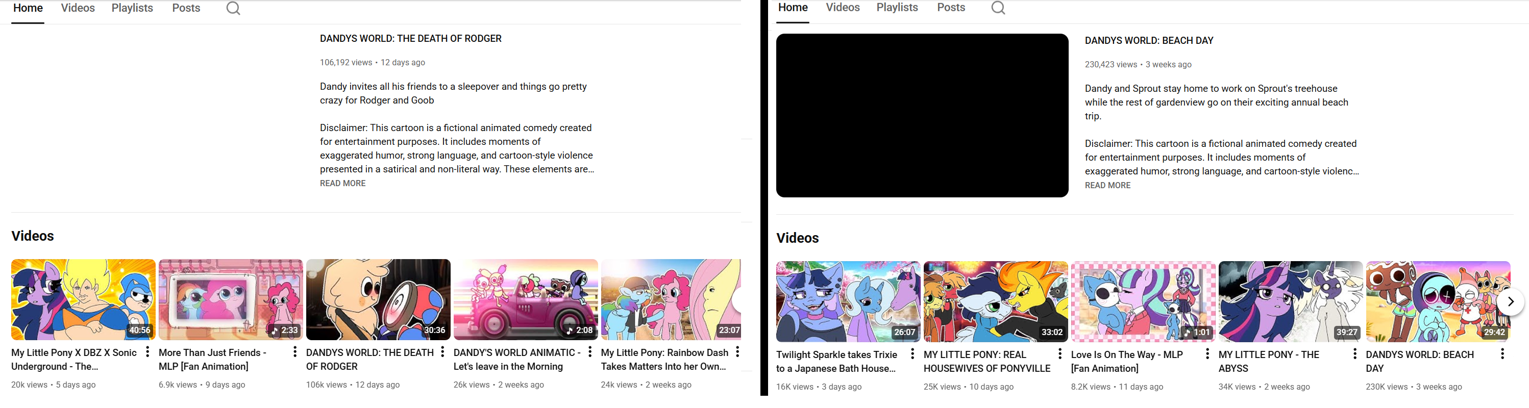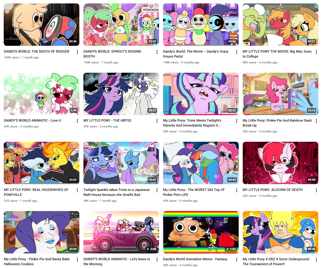 >>43122480>Ski Trip used to be age-restricted, and I think the Bath House one was, too, but not anymoreThey never were. >>43122478The only age restricted videos on his channel right now are Alicorn of Death and Rainbow, Dash Takes Matters Into her Own Hands and some Dandy ones