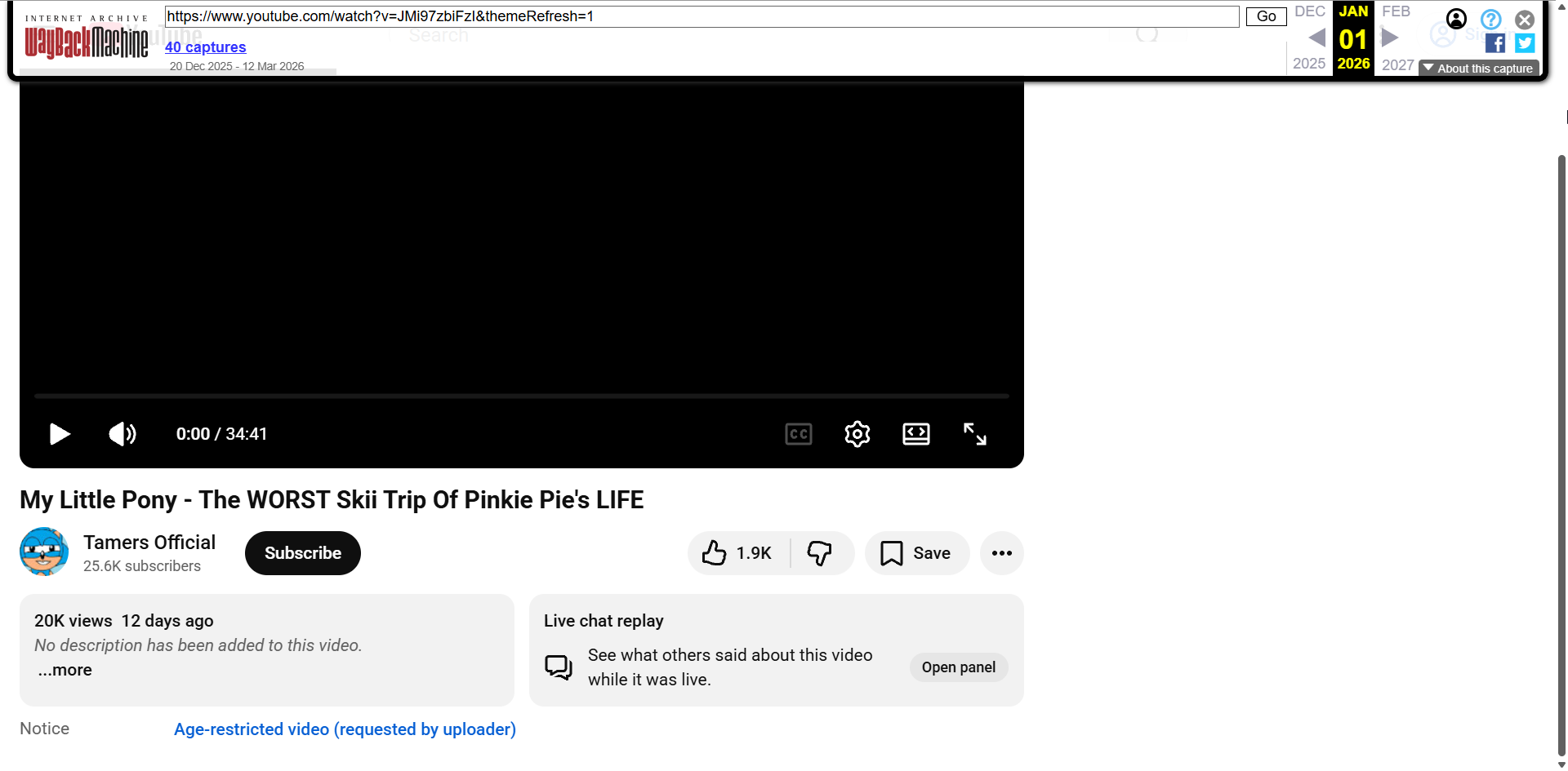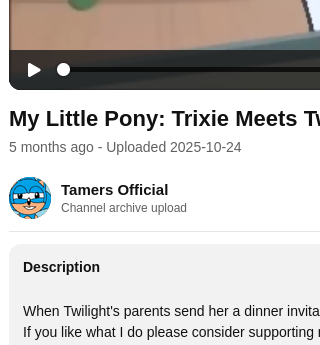 >>43145479A cursory search through Pony.tube and this Tamers archive >>43134545 gave no results.And I'm too much of an internet casual to get more than the links and thumbnails from the Waybackmachine.Doesn't look good.