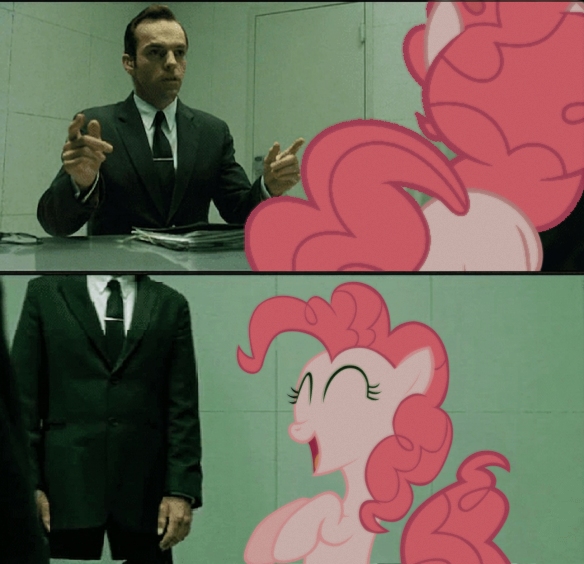 >"you seem to be living two lives, miss. Pie">"in one life you are Pinkamena Diane Pie. You work at a bakery, throw parties and make everyone laugh">"in the other life you call yourself "Pink π", you know how break the fourth wall and physic laws. You defy all logic to the point that you just don't make sense"