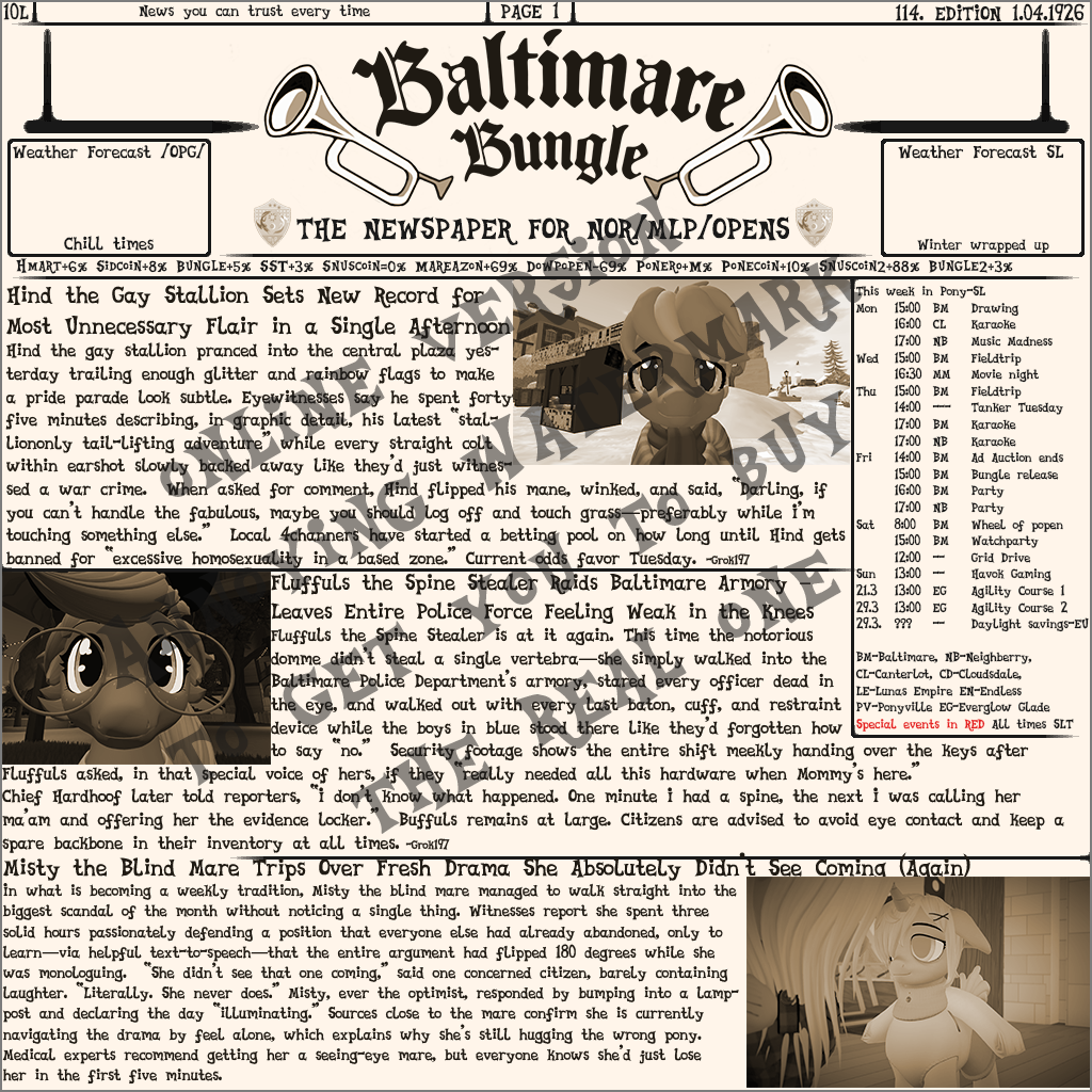 NEW BUNGLE JUST DROPPEDThat's right! And so fast too! As you may have noticed the rate of Bungles has sadly dropped a lot recently so we from the Bungle have decidedthat to speed up efficiency and remove bottlenecks in the production we will from now on embrace AI in our production. We want to assure the popensthat this will in no way change or alter the quality of our products. FOr todays articles we have wonderful and true articles about HIND, and Flufuflsand MISTY and PARA and reports about recent parties and so much more!>>43149615beat me to it baka