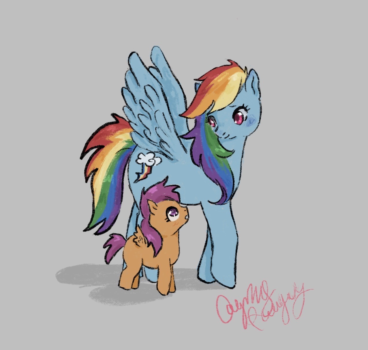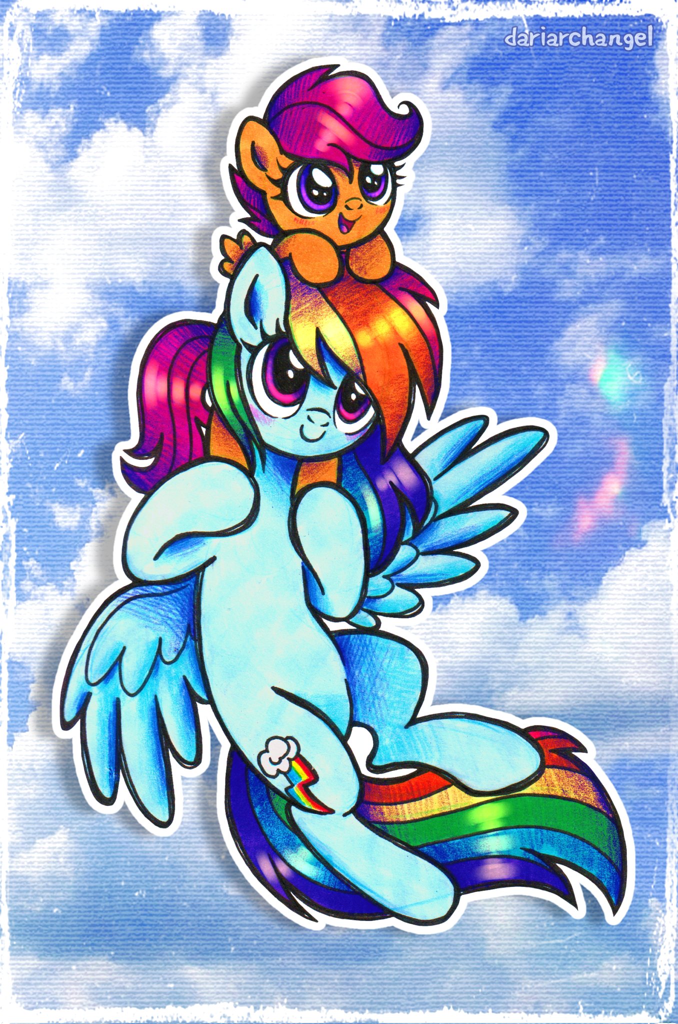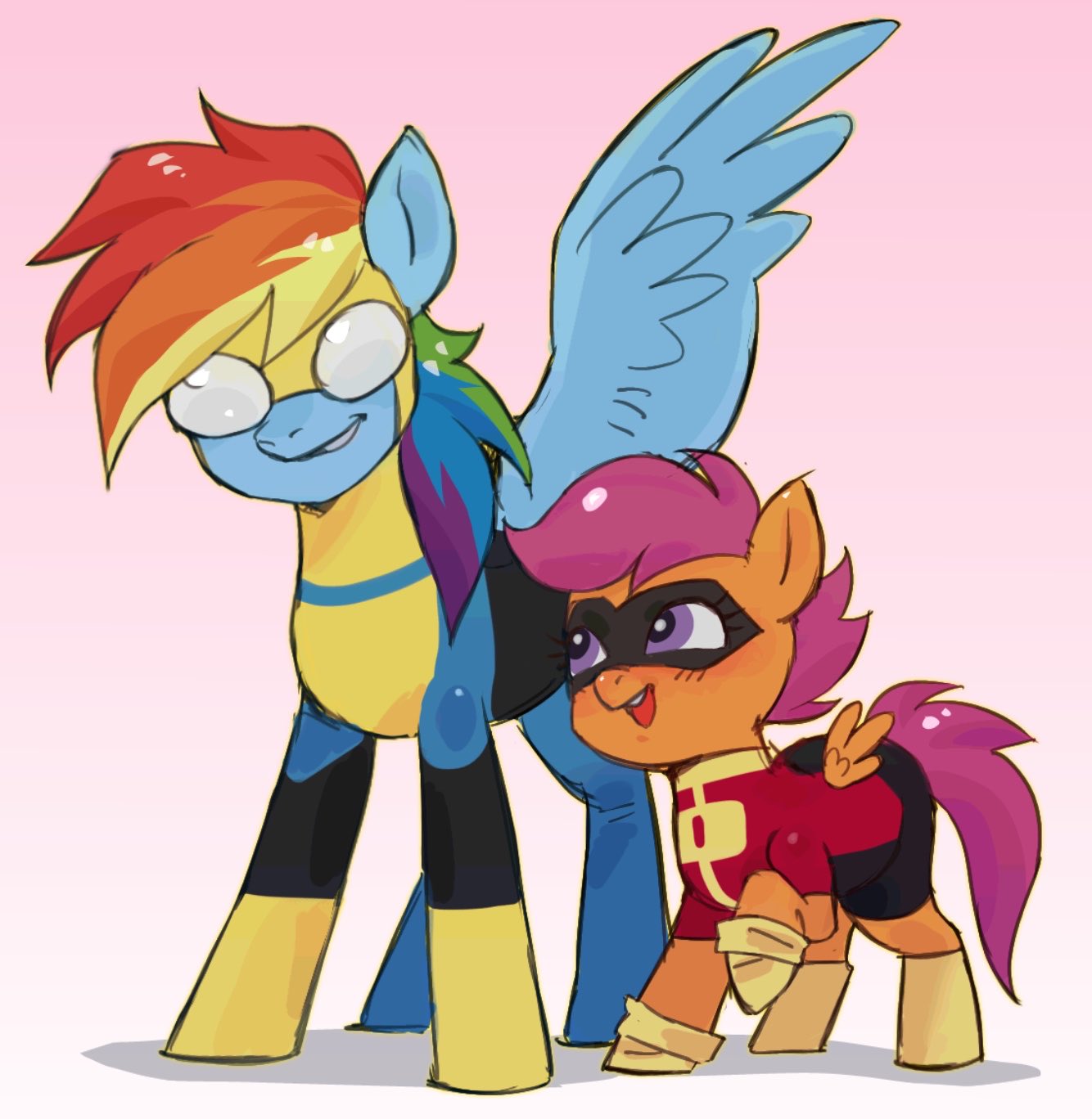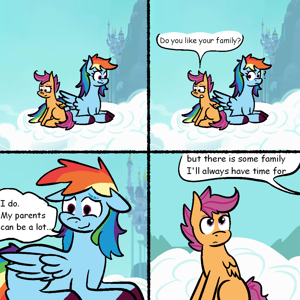 >>43161169A few million years ago, the artist was in the thread, someone posted that pic, and he complained that he accidentally colored part of Scootaloo's leg blue. I made an edit with how I think the pic was supposed to look like, but I don't remember if the artist actually confirmed that this is what he wanted. Anyways, I'm going to repost the edit just in case.