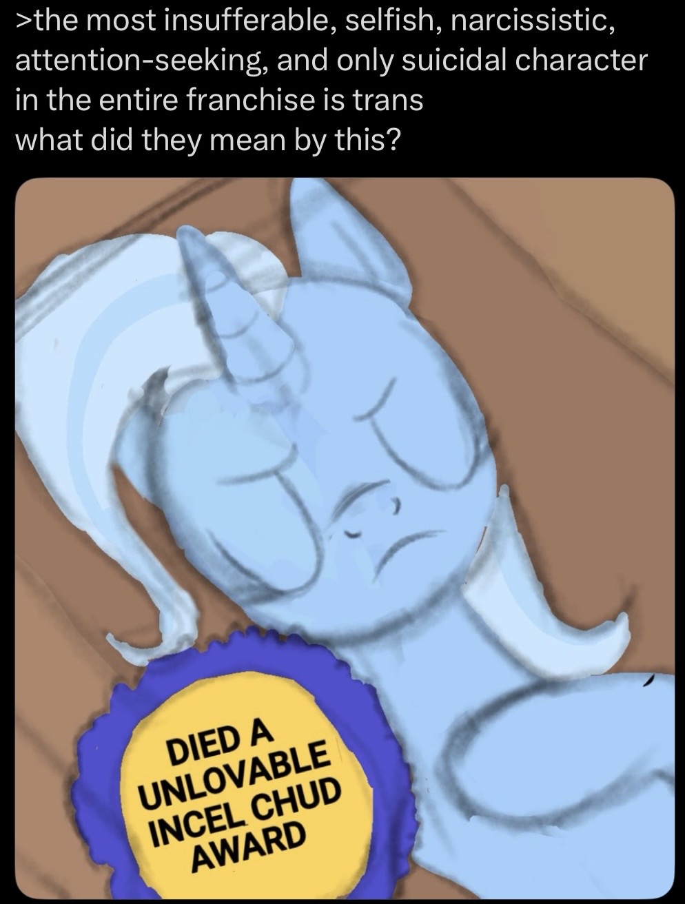 >>43142354>trixiefag speaks like an insufferable condescending narcissistOf course. Just like their character.
