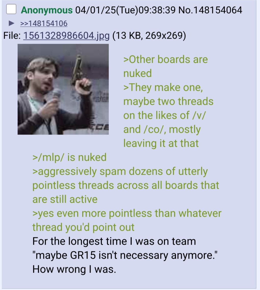 >>43147191IDs for all boards are a terrible idea and generally break the spirit of the siteStory time: I have rather dynamic IPs (mostly just phonefag a lot), so when I participate in generals on boards with IDs I'm usually listed as six-or-so different users. I don't reply to myself like a samefaggot nor do I "reveal" this to other anons, just posting as if IDs weren't a thing One time I, despite doing absolutely nothing extraordinary, managed to psyop a general without even realizing it. As I don't really care about hiding my horsefuckery, one general had noticed a rather high number of jokes related to MLP, making its members think that there were multiple ponyfags amongst them. This didn't result in any "general thread shitfighting", just in anons lol'ing for a couple of days about [identity1]fag being a brony or [identity2]fag being Goldson-lite. From what I remember the only real ponyfags in that thread were me and some other guy. 8 different horsefuckers reduced to just 2.I feel like IDs on slower boards would cause even more situations of this nature