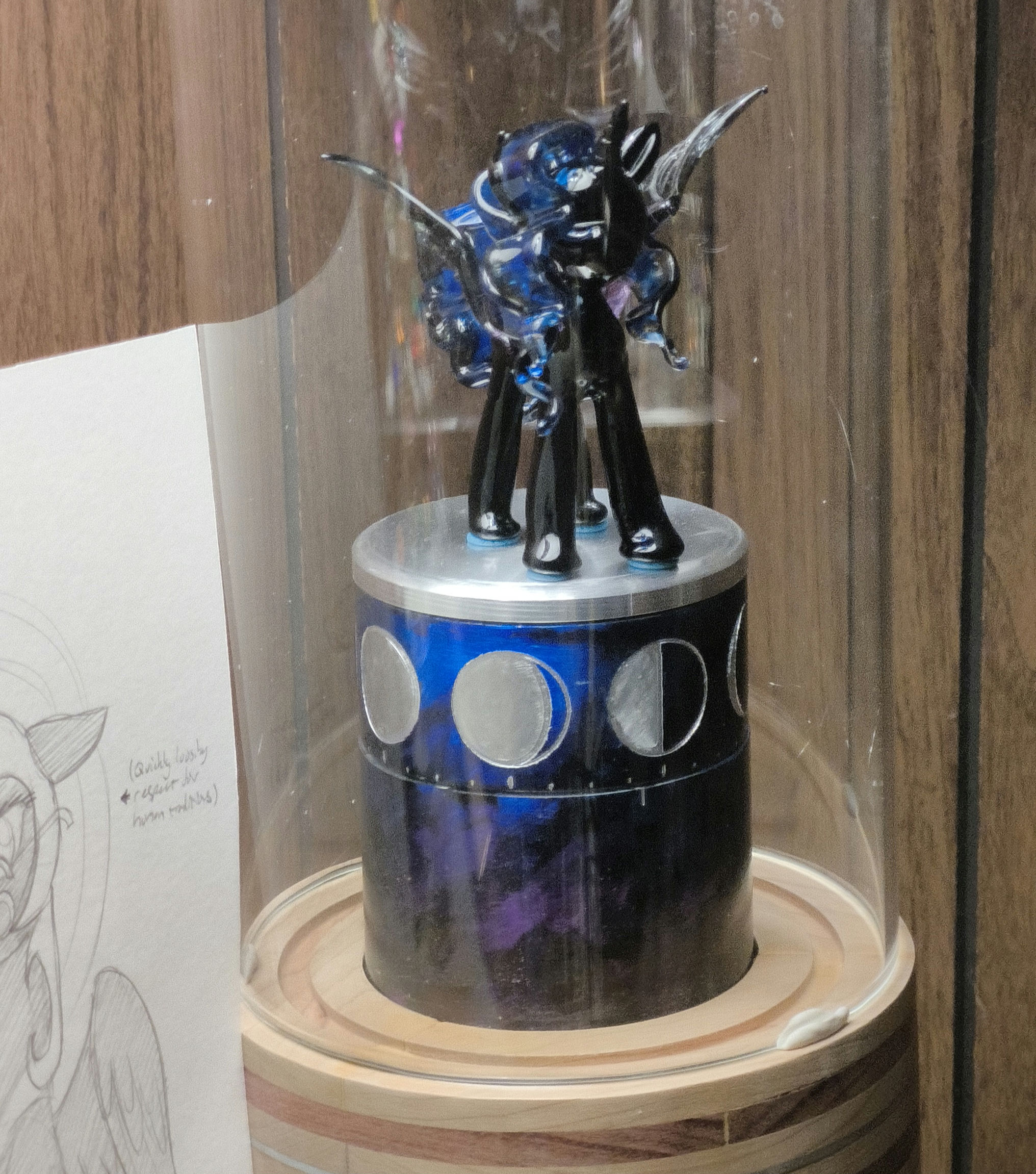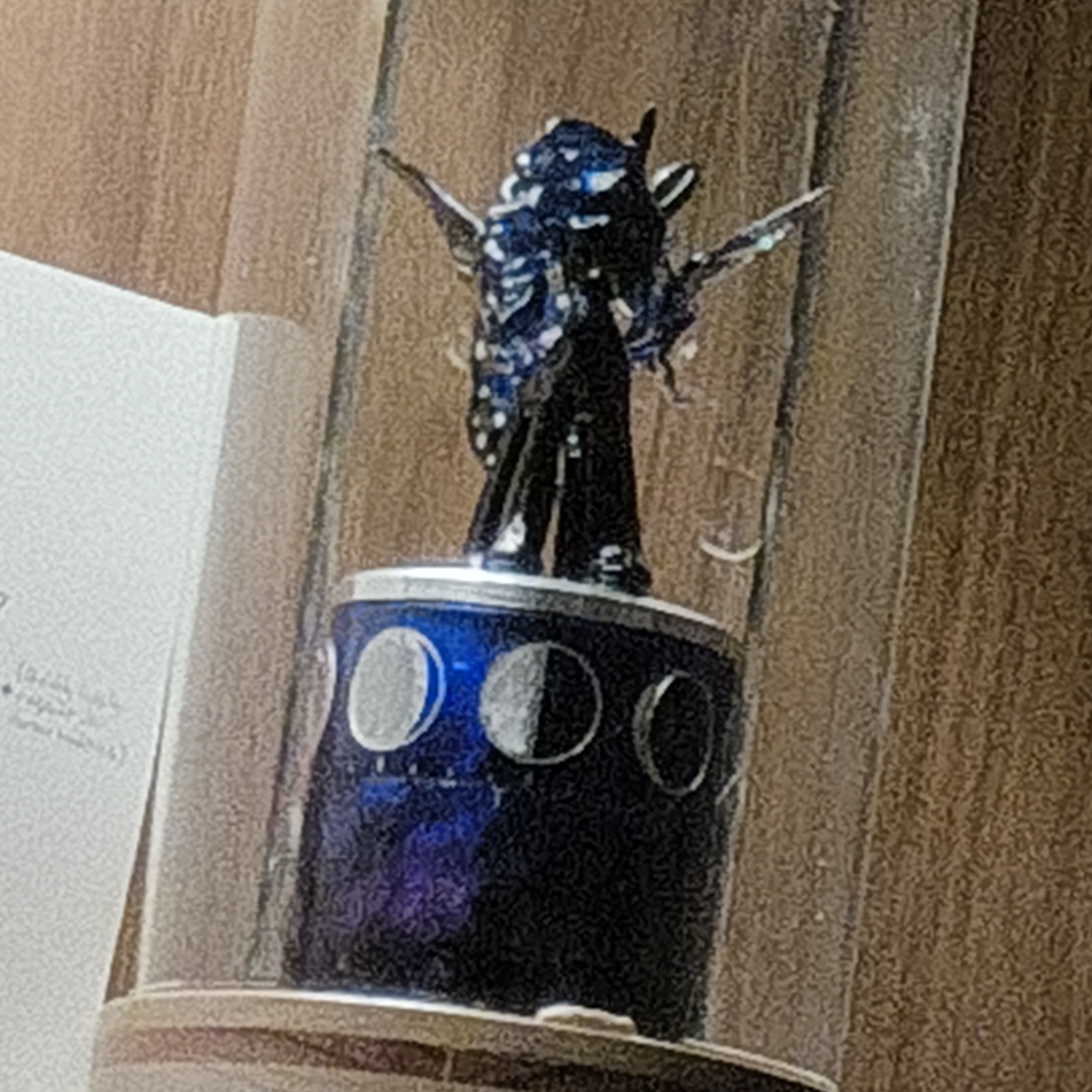 >>43165402Moon rotates throughout the day so that she is always facing our moon, and the phases of the moon beneath her also rotate, lining up whatever the current phase is with that notch at the bottom.She does kinda spend the mornings staring into the corner of the room, but... at nighttime, she keeps watch over me, so long as I'm in the living room.