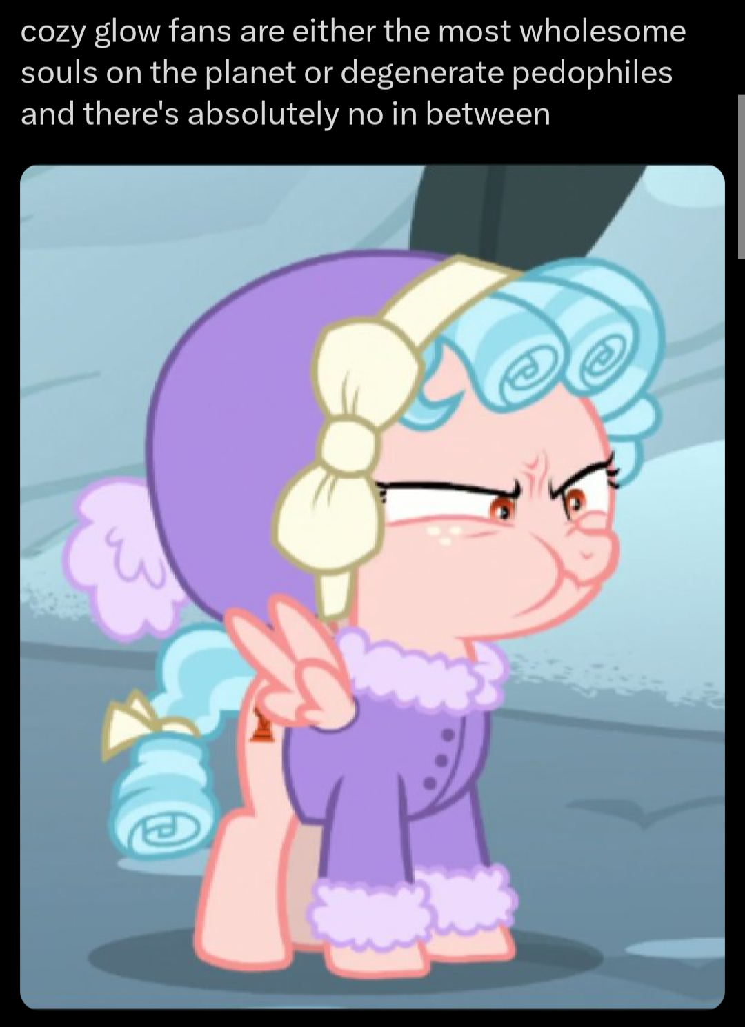 >>43167053Yeah, I've never seen a wholesome Cozy Glow fan. The whole point of being a fan is you like a character who's explicitly manipulative and evil.