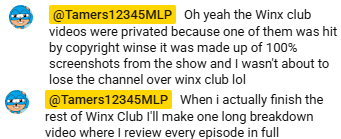 By the way, to those who missed it, Winx Club is coming back.The Winx Club reviews got taken off of the channel due to copyright strikes.The reason why Tamers hasn't reviewed the rest of the episodes is simply because he hasn't watched them yet, but when he does he's going to make a full video breakdown of the reboot series.It's going to be Tamers' first video essay and i can't wait.