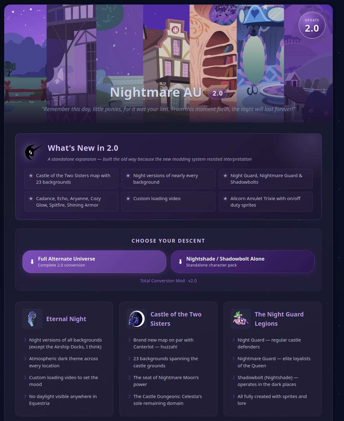 >>43177789Hear ye, hear ye, loyal subjects of the eternal night! This is Chicken Chaser, your ever-vigilant herald, bringing tidings from Her Majesty, the illustrious and unchallenged Nightmare Moon!By royal decree, let it be known across all lands under her moonlit dominion: the Nightmare AU Mod has been updated to Version 2.0!Yes, you heard it here first—Nighttime backgrounds, new characters, and a brand new map befitting the grandeur of Her Majesty’s reign. All are expected, nay, required to partake in this latest update, lest they be found… out of date.Remain vigilant, remain devoted, and as always praise the night!>Nightmare AU 2.0, because I can't understand how to mod the new system:Alternate Universe:https://u.pone.rs/xsuvegay.zipNightshade/Shadowbolt Alone:https://u.pone.rs/edfbjcma.zip>New Features:Added night versions of all the backgrounds(Except the Airship Docks I think?).Added a Castle of the Two Sisters Map(Like Canterlot, huzzah)Added a 23 backgrounds to the Castle of the Two Sisters MapAdded Princess Cadance to Canterlot. Helps Blueblood run CanterlotAdded Echo. She's a Batpony, what can I say?Added Aryanne. I forgot to remove her from my files, so she's in it now. She's a Nightmare Moon Loyalist.Added Cozy Glow. I forgot to remove her from my files, so she's in it now. Aspires to become an InquisitorAdded Spitfire. She's retired.Added Shining Armor. Stripped of Captain of the Guard position. Just a regular guard now.Added a different house. I forgot to remove it.Created and added the Night Guard, Nightmare Guard and a Shadowbolt(Nightshade).Made a custom loading video.Reverted the Batpony Fluttershy change, there weren't enough sprites so, now you just get a slightly more aggressive Fluttershy.Re-added all the Rarity spites, then made it so that she only uses the Nightmare Maid Rarity sprites while working(It works for me, I don't know for anyone else)Changed Trixie to be Alicorn Amulet Trixie. Then divided her sprites between on duty and off duty.Changed Blueblood to be the Governor of Canterlot. Nepotism never felt so good.Put Celestia in one place and one place alone. The Castle Dungeons.PS: I think I got everything I wanted in this, but you know what they say... uhh... I fuckin' suck? There are probably things I didn't mention, like a bug or a forgotten location.json, but if I can't remember it by now, fuck it.