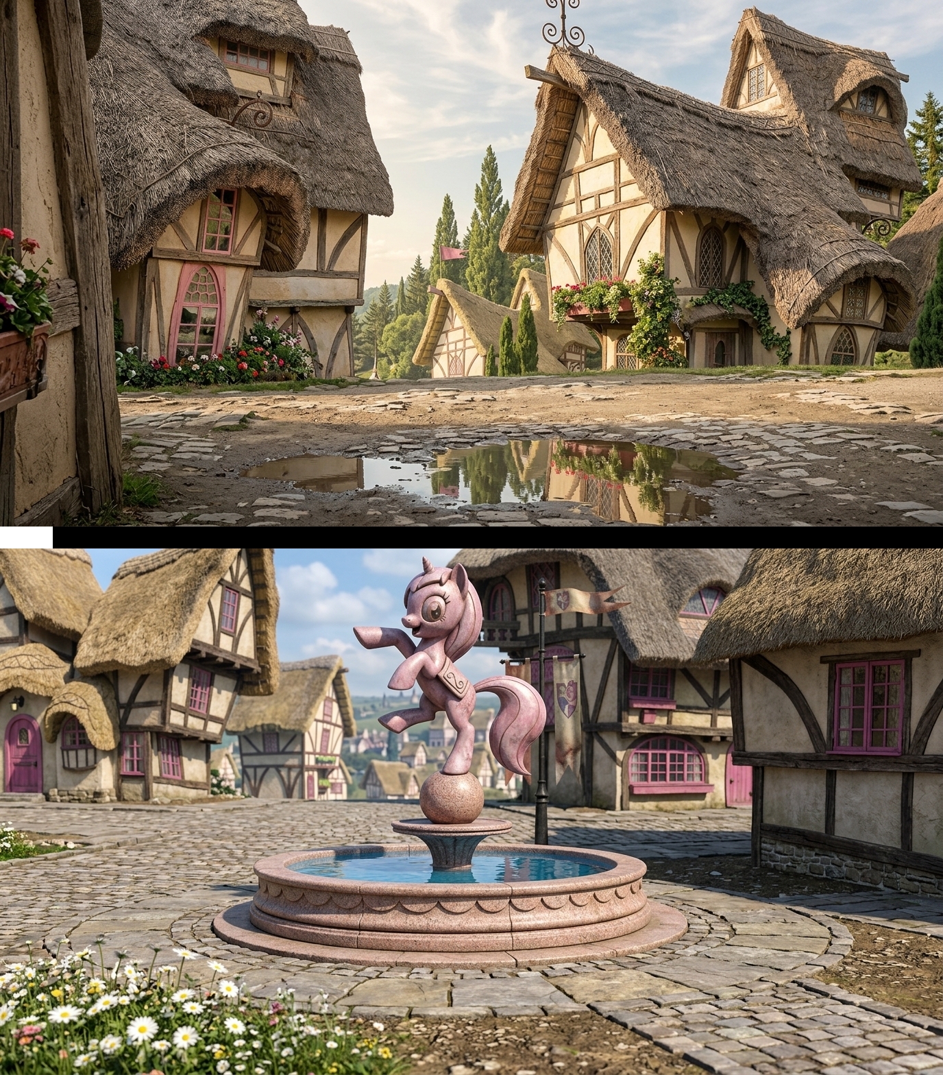 Now make these into 3d models. Put them in a game engine and make a beautiful Ponyville walking simulator. No DLSS/RTX bs, crisp clean raster graphics. No modern blurryshit.