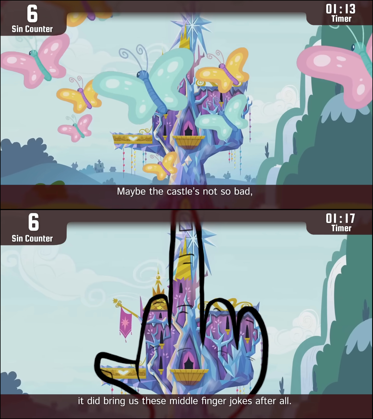 I cannot accept that her tree house was replaced by this fuck huge dread shrub made out of fucking crystals and a full purple castle on top what the fuck, and it's in the middle of town!? Realistically this probably destroyed the nearby houses with how much space it takes. This is like building a skyscraper in the middle of a trailer park what the fuck?