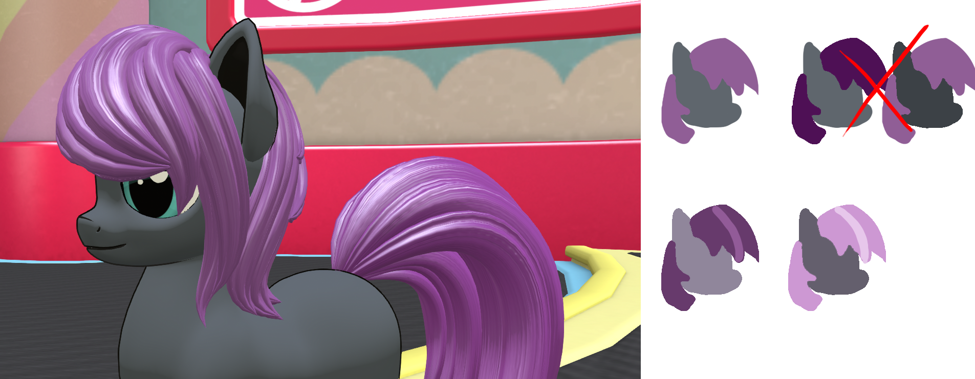 >>43207506Ponies with dark coats are pretty rare, ponies with dark gray coats are even rarer, and the ones that do manage to make it work, usually have much lighter manes (think Night Glider, Thunderlane, Hoity Toity etc). Even then, most of them are very subtly colored in one direction or another, and aren't just totally desaturated grays.If you have a midtone gray and a midtone color, the result is that it's all kind of muddy, because gray doesn't really stand out well against anything and it doesn't complement it either. It's sort of the worst at everything. I might recommend pushing those grays ever so slightly closer to purple, and ditching the spec map so it isn't as aggressively glossy. Also these are very batty colors. Is your OC a batpony?