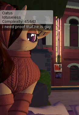 >>43208413the weird thing is that i'm actually pretty outgoing and social IRL, at least with other horsefuckers. it's just that specifically virtual worlds like SL tickled my autism in the wrong way until last night... now it's the right way. i think it stemmed from something of "oh shit i have to choose who i'm going to be and what if people don't like my choice" and the answer to the what if turned out to be "they'll either not give a shit or help make it better"