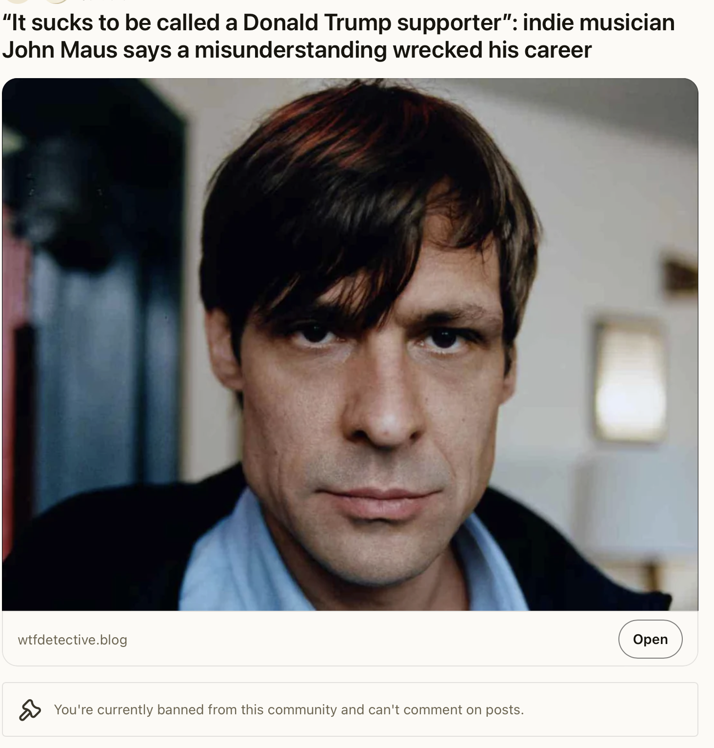 now that John Maus has gone on a full publicity tour prostrating himself on the altar for his naughty politics, surely the tolerant masses all humbly accept his apology, right?>Man, it's a greatest hits of backtracking and bullshit>LOL, fuck John Maus ‘til the heat death of the universe.>Why do my actions have consequence!?!>It'd actually be pretty easy to say "I made a mistake being there, my bad." But instead he has to put everything through a "yeah the insurrection was bad but people calling me names are just as bad!" lense.>'I ruined my own career but it's every one else's fault for not understanding me.'>Musician ego. Ick.
