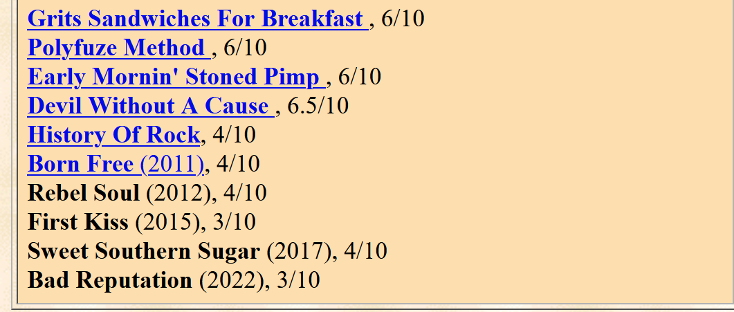 >>129408199I have an idea about how to make proper reivews, first you need to determine which mood the music on average intends to induce and then the 0 to 10 rating makes sense on how effective it is at inducing it. Kid Rock music is not bad at making you feel badass but there is def better bands. Kid Rock is something that sort of fits in a Gym while lifting.