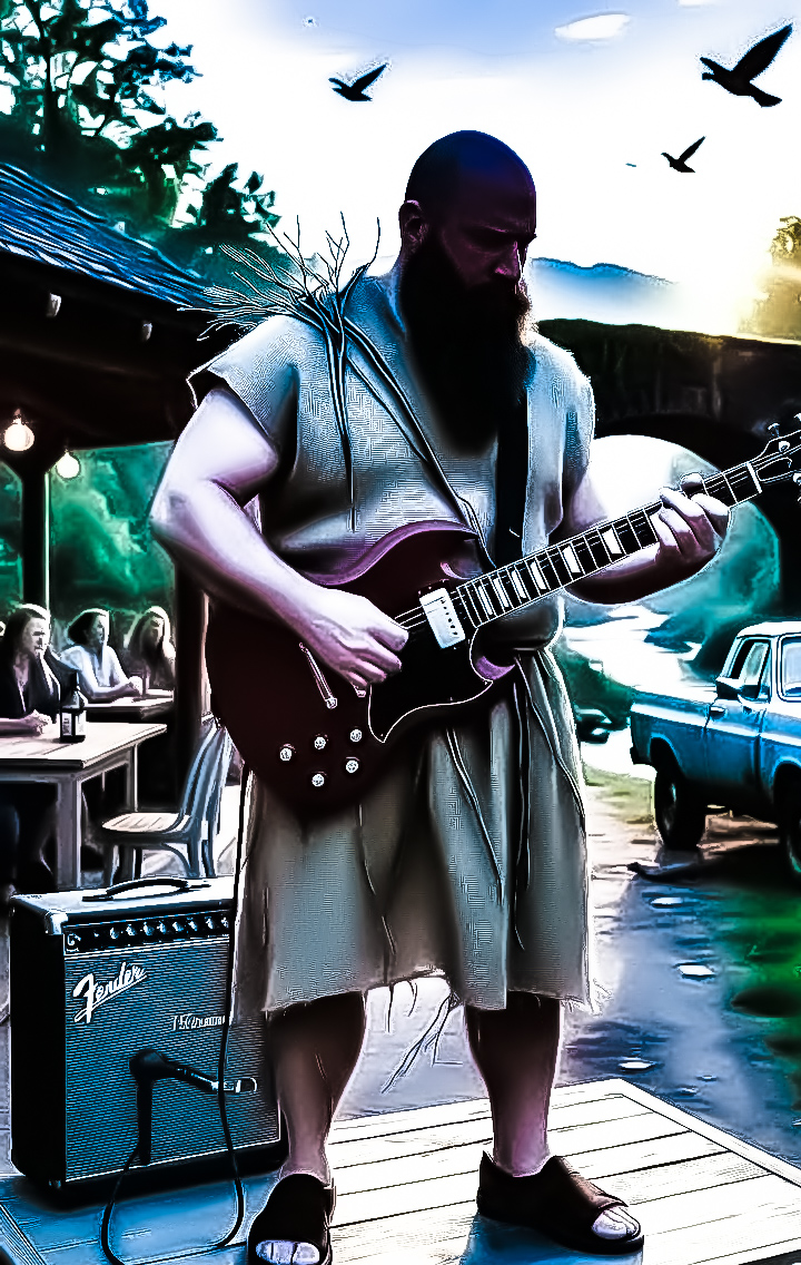 He woke up, not knowing where he was, it was still dark but the flying birds were chirping, seeing the sun's rays from the higher vantage point. He didn't have much time. His potato sack robe catching on twigs. He took a small bottle containing a tincture of ginger, psilocybin mushrooms, and sinsemilla. He swallowed it. He had been fasting in the forest. For how long he didn't know. He suddenly remembered he had a gig at the brunch cafe in town. He found a stream, knowing it would lead to a road. He flipped an old Greek coin to decide which way. He came to a moss covered stone bridge and grabbed his stashed cherry red sg out of a submerged chest. Hours later he reached a county road. He waited, thumb up. An old pickup, rusted and sky blue, sputtered to a stop. "Know where a fella can get a ride round these parts, cowboy?" The good Samaritan gently came to a stop in front of the cafe. Neither of them spoke. He grabbed his sg, and the driver knowingly pulled away. The amp they set up for him was already turned on, with a chord plugged in. The drummer and synth player had been waiting, wondering if he'd show. His potato sack robe covered in twigs. He forgot about the mushroom tincture. He thought he could see the taste of the air. The small crowd starring through his soul. He had no choice. He plugged into the Fender Frontman 15g, and played his last imaginary guitar solo...