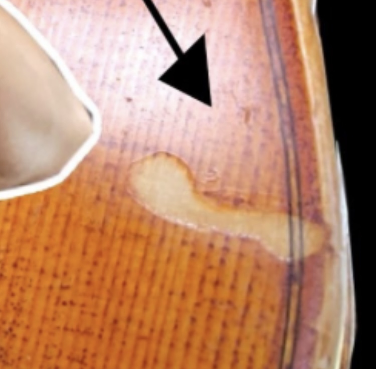 >>128122980Solvent gasses liquify the finish and it gets smudged when touched. The finish is removed typically all the way to the bare wood and is then smudged to other parts of the instrument and and creates a large hump or wrinkle. You can look up pics of wall hangers destroying guitar finishes but pic related is hand sanitizer that got on a violin