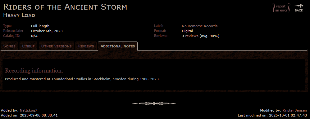 >>128196297Okay so I'm doing some more sleuthing on Metallum since they have a biography for the band, and I noticed some stuff. >In 1987, the Wahlquist brothers kick-started the band yet again and recorded an album with ex-UFO bassist Paul Gray and guitarist Patrik Karlsson. This album was never released, though. That demo tape was recorded sometime in 1987, so it's almost guaranteed to be related to that brief comeback. But what struck me as odd was the additional notes section for Riders of the Ancient Storm.>Produced and mastered at Thunderload Studios in Stockholm, Sweden during 1986-2023.Assuming everything on their page is legitimate information, are there two separate unreleased albums from 1986 and 1987?